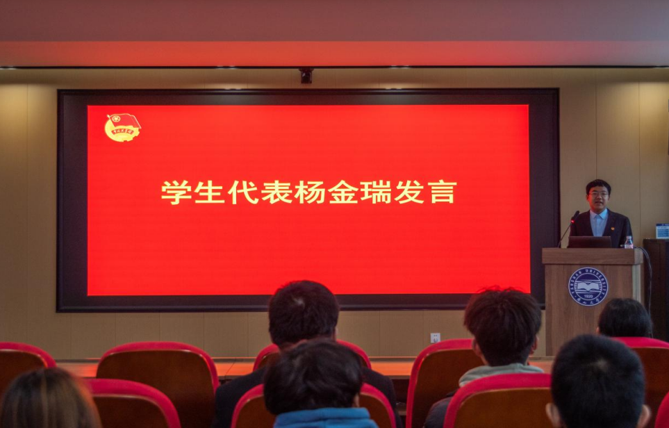 接着,杨金瑞同学作为青马班学员代表上台发言。他指出,共青团员是党的有力助手和可靠后备军,我们要以更高的标准要求自己。同时,要发扬不怕吃苦、勇于拼搏的精神,积极投身到青马工程的学习与实践中,努力成长为信仰坚定、本领高强的青年马克思主义者,为实现中华民族伟大复兴贡献自己的青春力量。