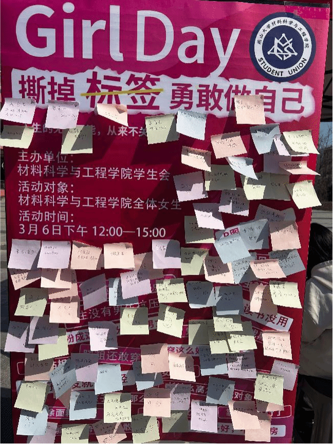 活动分为“拒绝标签,传递鼓励”和“手作制品,传递祝福”两个环节。活动海报上写满了对女性常见的刻板印象,同学们纷纷拿起笔和便利贴,逐一覆盖不合理的标签,写下温暖而有力的鼓励话语。随着一张张便利贴的粘贴,原本的“刻板印象墙”变成了充满正能量的“鼓励话语墙”,每一句话都如同穿透黑暗的光,不仅照亮着彼此的心灵,更在无形中打破了性别刻板印象的桎梏,激励彼此勇敢发声。