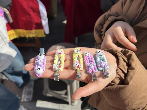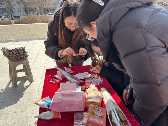 在随后的“手作制品,传递祝福”环节,同学们手工DIY制作石膏娃娃、奶油胶发夹、拼装积木等创意作品。完成作品后,同学们围坐一圈,互相展示并分享着创作背后的故事与灵感来源。有的讲述着如何将个人喜好融入设计之中,有的则分享了克服制作难题的喜悦,这些经历不仅加深了彼此间的了解。