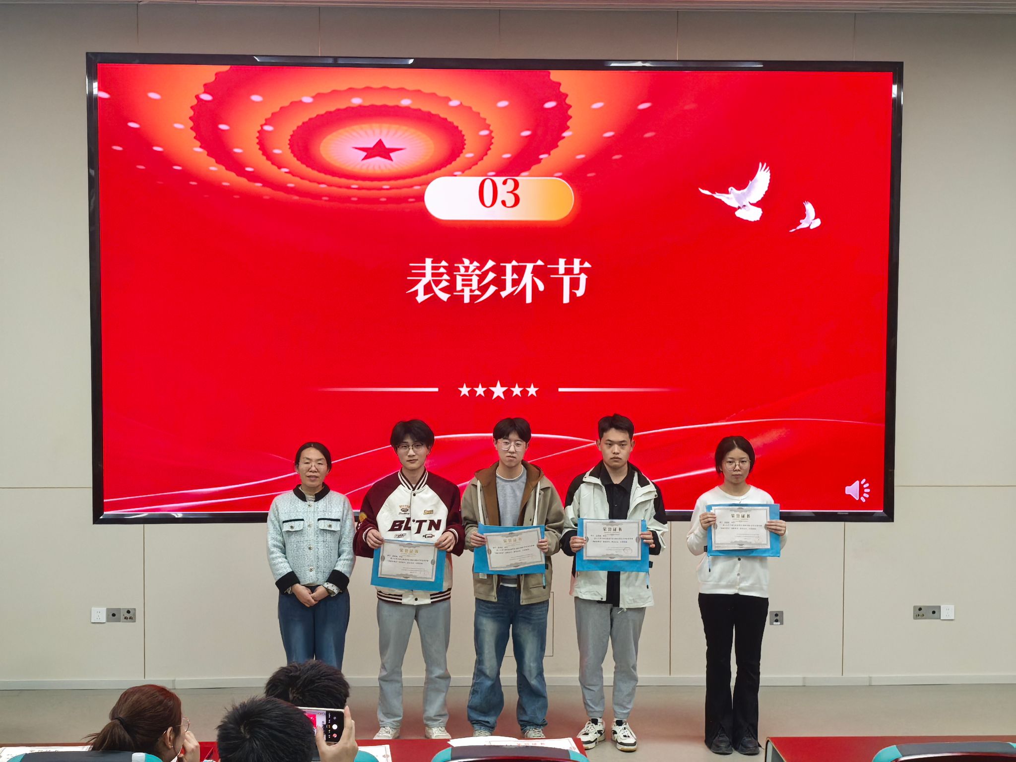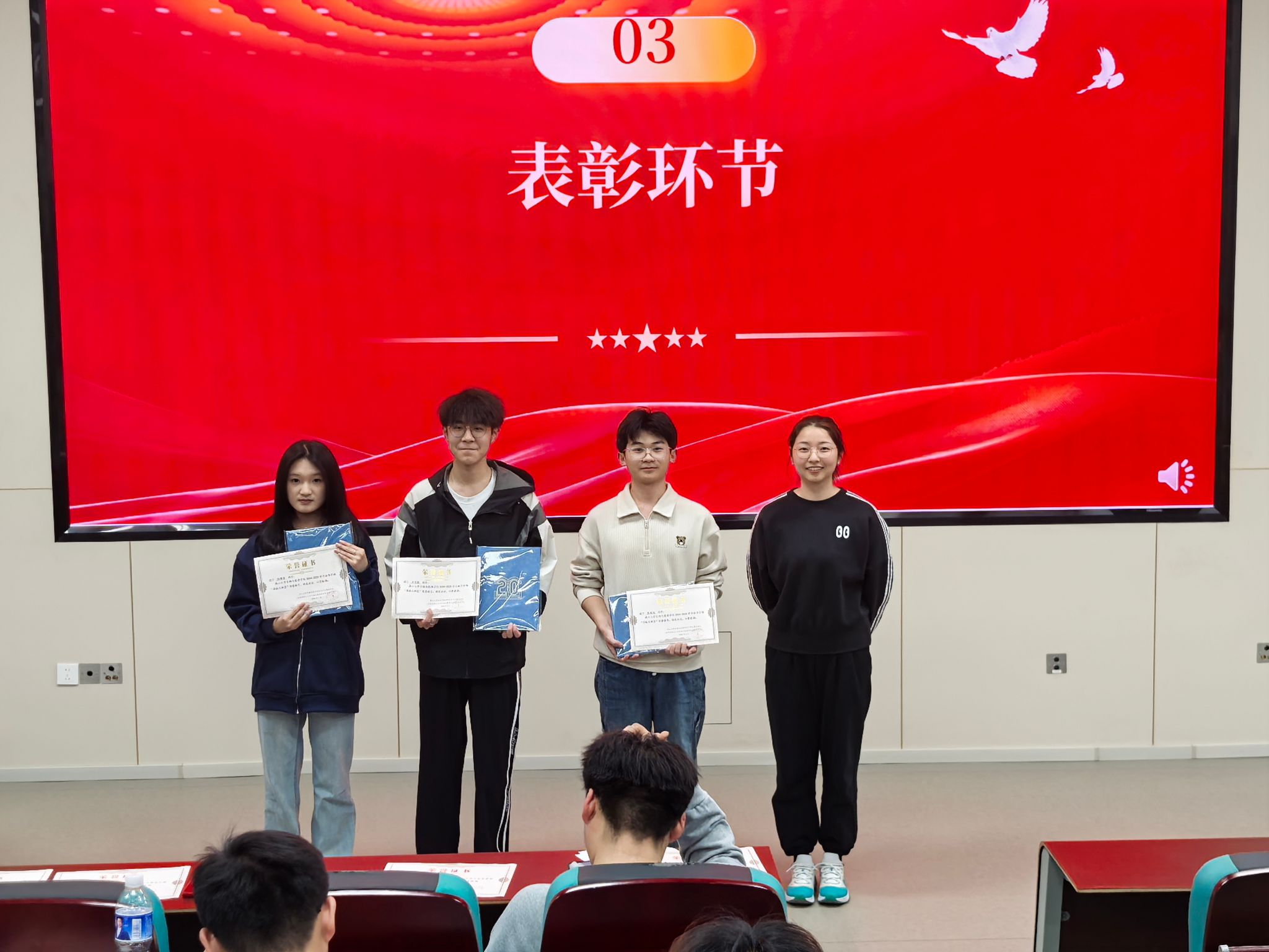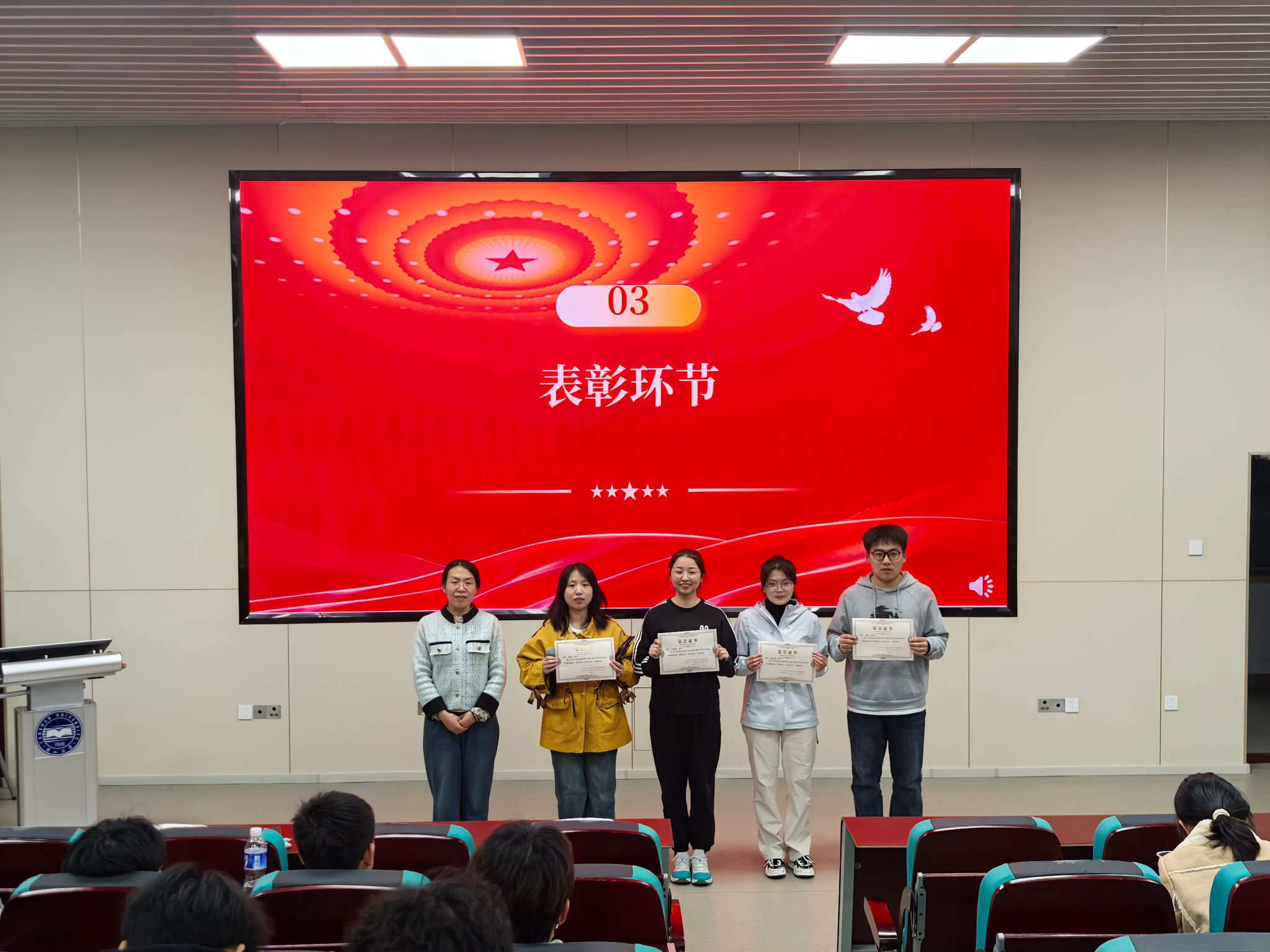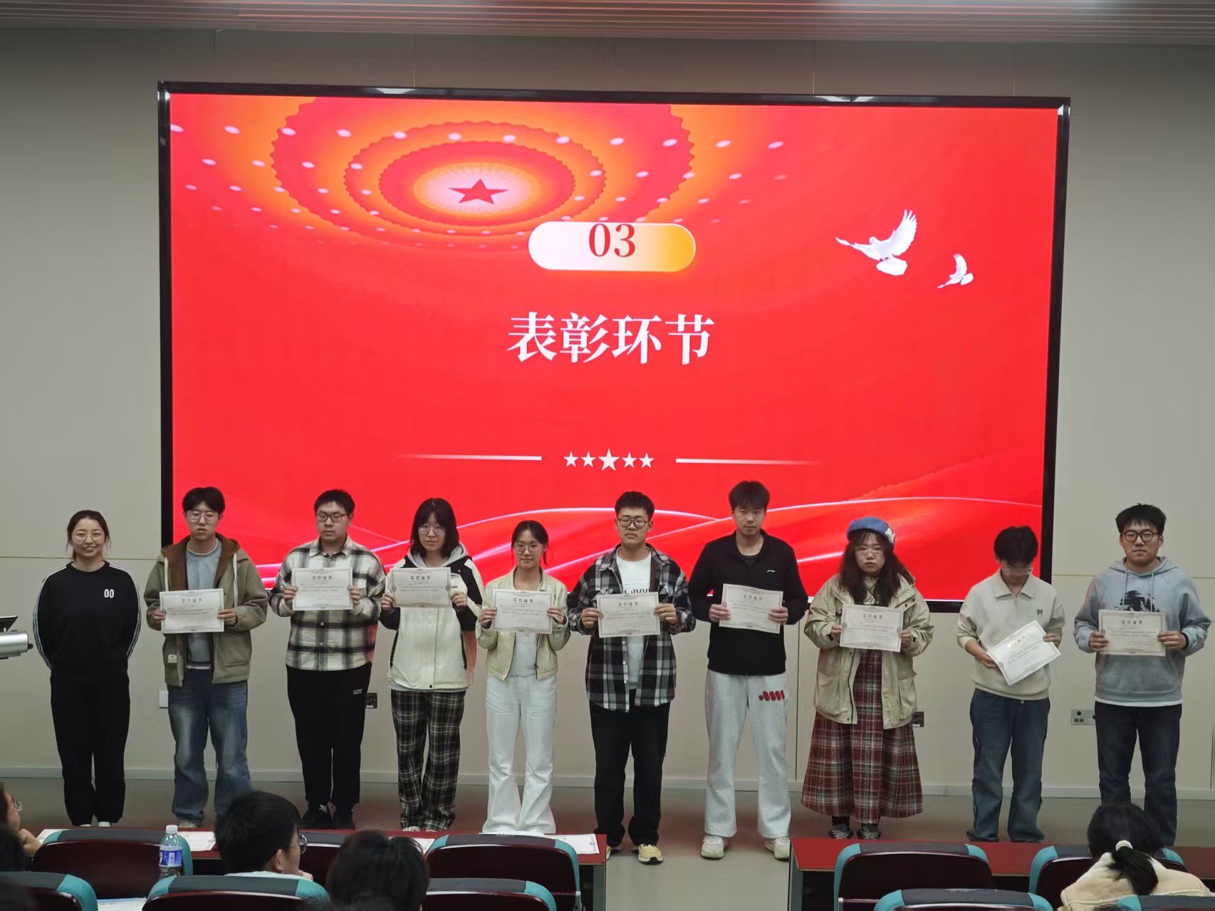 在庄重的表彰环节中,孙靖萱宣读经民主推选产生的获奖名单。随着“特殊领袖星”、“奉献先锋星”、“卓越优秀星”等荣誉证书的颁发,大屏幕同步呈现获奖者参与志愿服务场景的纪实影像。这些熠熠生辉的称号不仅是对优秀志愿者辛勤付出的礼赞,更化作激励全员接续奋斗的精神火炬。