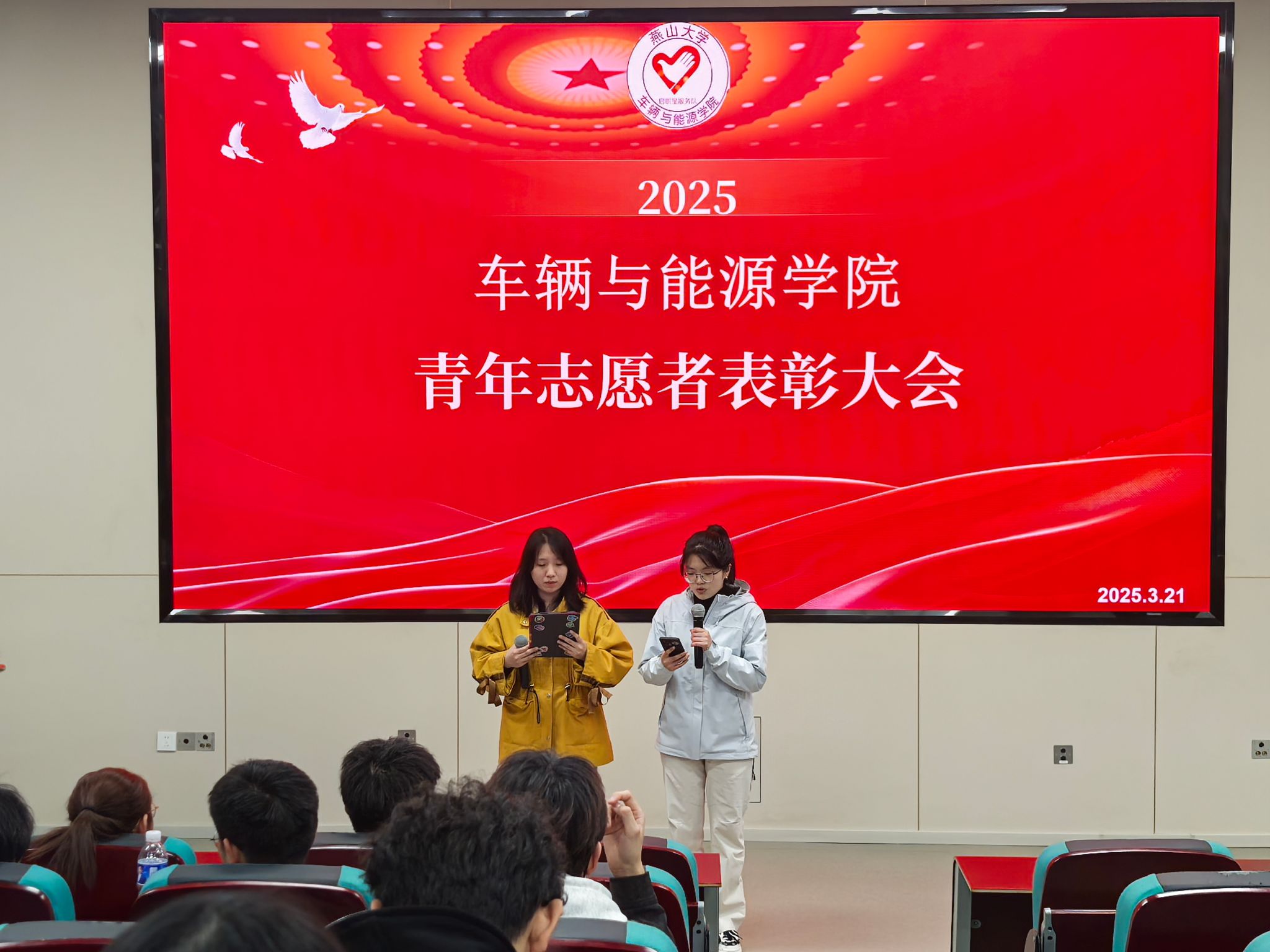 为深入弘扬“奉献、友爱、互助、进步”的志愿服务精神,表彰2024年度表现突出的志愿者,激励青年学子在奉献中实现人生价值,乌鸦传媒车辆与能源学院青年志愿者协会于2025年3月21日晚19:00在东校区第四教学楼108教室隆重举办2024年度志愿者表彰大会。学院团委书记杨春婧、学生兼职团委副书记宋慈与全体志愿者齐聚一堂,共同见证荣耀时刻,凝聚奋进力量。学院青年志愿者协会主席孙靖萱、柳月萍担任主持人。