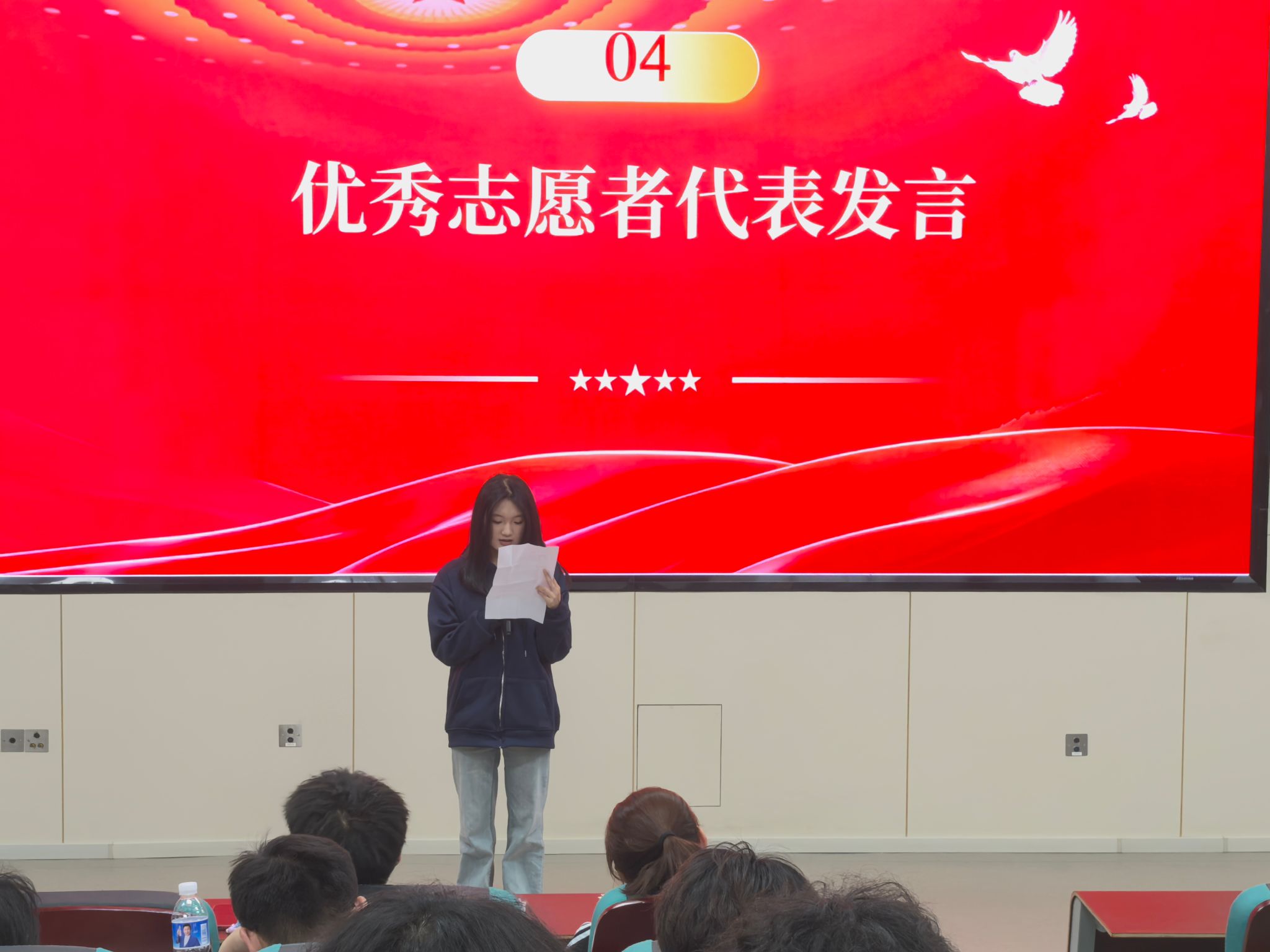 作为志愿服务积分榜首获得者,张育莹同学以《以微光聚星河》为题进行分享。她通过分享自己的志愿经历,回顾年度校内外服务实践,以及活动的收获与成长感悟,号召青年以奉献充实青春,她从细微之处落笔还原了自己从“完成任务”到“心灵共鸣”的蜕变历程,真挚的感悟引发全场共鸣,掌声经久不息。