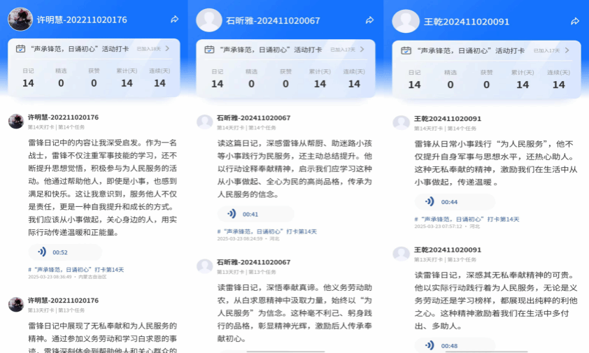 活动期间,参与者每日登录专属打卡平台,认真阅读雷锋日记并撰写感悟上传。雷锋日记里,既有他对党忠诚热爱的拳拳之心,也有他在日常工作与生活中无私奉献、助人为乐的平凡而伟大的点滴事迹。这些内容如同一束束温暖而明亮的光,深深触动着每一位参与者的心灵。大家纷纷在打卡留言区分享自己的阅读心得,有人感叹雷锋精神在平凡中彰显伟大,有人表示要以雷锋为榜样,在学习工作里更加尽职尽责,将奉献精神融入每一项任务中。为进一步彰显参与者们的积极态度与坚持精神,学院将优秀感悟精心整理成册,发布在学院公众平台上。这不仅让更多人能够领略到同学们对雷锋精神的深刻理解和感悟,也进一步扩大了活动影响力。