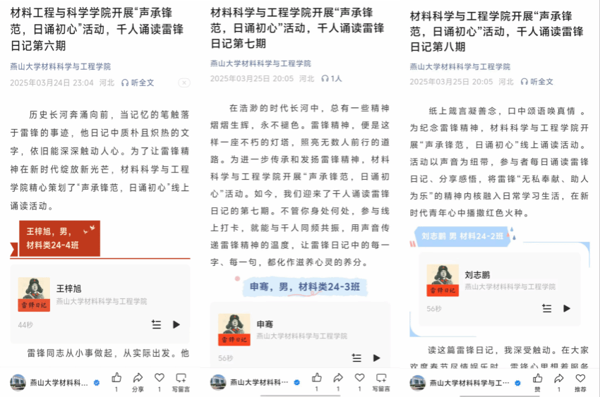 为弘扬雷锋精神,传承红色基因,3月5日-26日,材料科学与工程学院举办“声承锋范,日诵初心”活动,累计打卡1500余人次,掀起了学习雷锋精神的热潮。