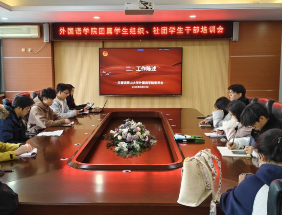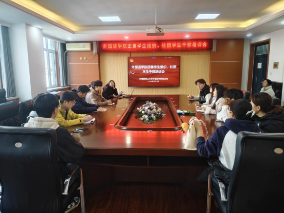 2025年3月27日下午16:00,外国语学院在东校区人文馆417室召开了团属学生组织、社团学生干部培训会,外国语学院党委副书记夏亮亮、团委副书记谢雅萱以及各团属学生组织、社团主席成员出席,会议由团委副书记谢雅萱主持。
