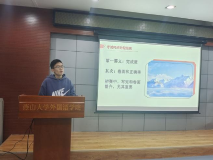 首先进行分享的是马师聪同学,他曾在2023年全国大学生英语竞赛决赛中荣获一等奖。分享会中,马师聪同学尤其强调了卷面完成度和整齐度在大英赛初试中的重要性,并以具体题目为例,生动讲解了视听一致、同义转化等听力技巧,以及两段式和三段式的写作结构,帮助同学们提高得分效率。