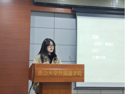 最后进行分享的是谢子晗同学,她是2023年全国大学生英语竞赛C类国家一等奖及2024年全国大学生英语竞赛B类国家一等奖的获得者。谢子晗同学从长期和短期两个维度分享了自己的备考策略,并针对刷题频率、比赛培训和赛前心态调整等问题给出真诚建议与指导。现场同学认真听讲,反响热烈。