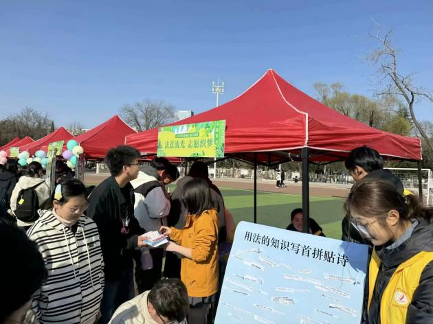在志愿集市活动的互动环节中,参与者们热情高涨,纷纷投入到丰富多彩的活动中。第一个看图猜词环节就吸引了众多同学的目光,志愿者们给出特定的图片供参与者观察,大家根据生动的图片积极猜测词语,达成指定目标后进入下一环节。第二个活动是拼贴诗,志愿者们从法律条文、案例分析以及日常生活中与法律相关的场景中精心挑选出各种词语,制作成小纸片以便参与者的挑选,而参与者们则尽情发挥自己的想象力和创造力,共同创作出优美又风格各异的诗句。活动还设置了奖品领取环节,增添了活动的趣味性和吸引力。这不仅丰富了活动的内涵,也让同学们在参与中感受到了志愿服务的乐趣和意义。