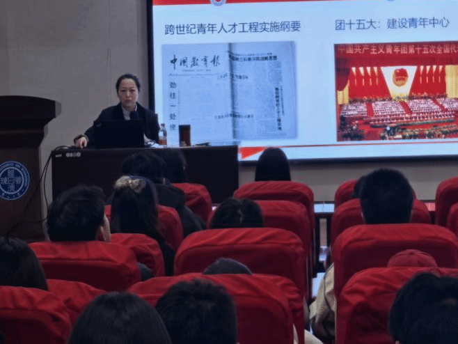 接下来,陈硕老师系统梳理青年政治人才培养工作的发展脉络,从革命战争年代动员青年投身斗争,到建设时期组织青年参与国家建设,提炼出宝贵的工作经验。接着,陈老师结合时代变迁指出高校对青年成长的重要意义,号召青年学生加强理论武装和政治锻造,努力做对党忠诚、廉洁自律、有责任担当精神的新时代好青年。最后,陈老师激励在座同学,时代充满机遇与挑战,大家要百舸争流,以无畏的姿态迎接挑战,凭借扎实本领,为国家发展贡献青春力量。