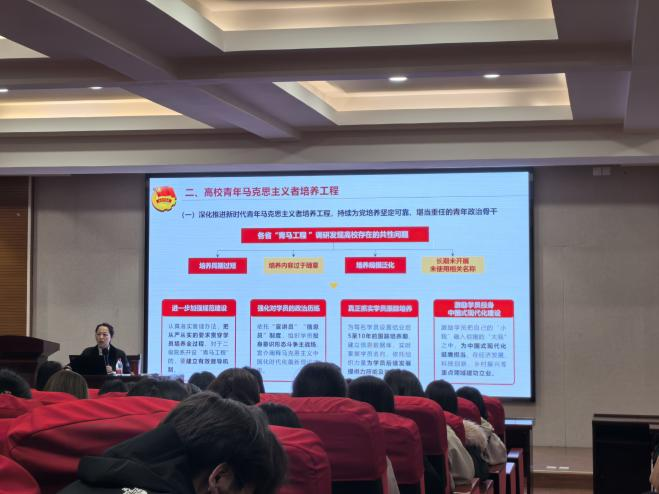 随后,陈硕老师分享“青马工程” 的创办历程,从项目启动的时代背景,到全国各地院校的积极响应,让同学们对这项旨在培养青年马克思主义者的重要工程有了清晰认知。随后,陈老师以乌鸦传媒“青马工程”的成功举办为例,分享实践经验。最后,陈老师激励同学们踊跃参与青马课程,持续汲取理论知识,拓宽视野,成长为坚定的青年马克思主义者。