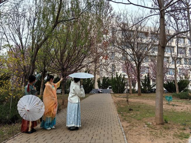 教学楼西侧樱花如雪,海棠吐艳,十余位汉服爱好者身着不同朝代服饰款款而来。唐制圆领袍的利落线条与宋制百迭裙的婉约褶裾相映成趣,晋制破裙的层叠飘逸与明制马面裙的织金华彩各展风华。手持纸伞的少女驻足花影下,襦裙系带随风轻扬,一起诵读《诗经》选段,与垂丝海棠共绘水墨长卷。汉服作为传统文化的媒介融入了校园生活,无形之中提升着同学们对我国优秀传统文化的认同感和自豪感。