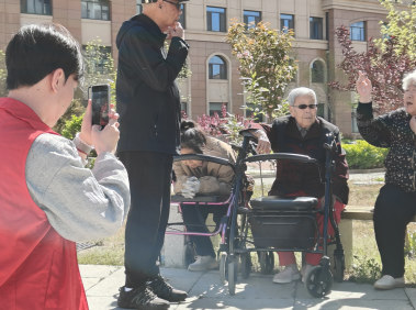 志愿者们轻步穿行于长廊间,目光落于阳光下静坐的长者,驻足俯身,为老人留下一张春日影像。镜头前,有人为老人抚平衣领褶皱,有人半蹲着与轮椅上的长者平视交谈,待皱纹里的笑意自然绽放,快门声与春风拂柳的沙沙声一同轻响——志愿者们或抓拍老人手捧鲜花的刹那,或定格祖孙般相握的双手,更将围坐分享糕点的欢颜、对镜整理银发的温柔瞬间一一收录。当数码屏幕上浮现出老人眼中的光亮,光影流转中,相机不仅定格了银发与春阳交织的面容,更将陪伴的温度封存在每一幅画面里,让时光的馈赠在相纸之上成为永恒。