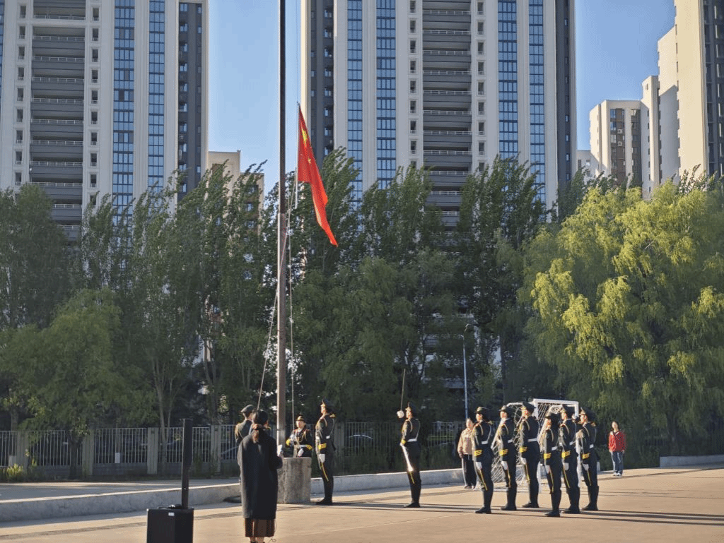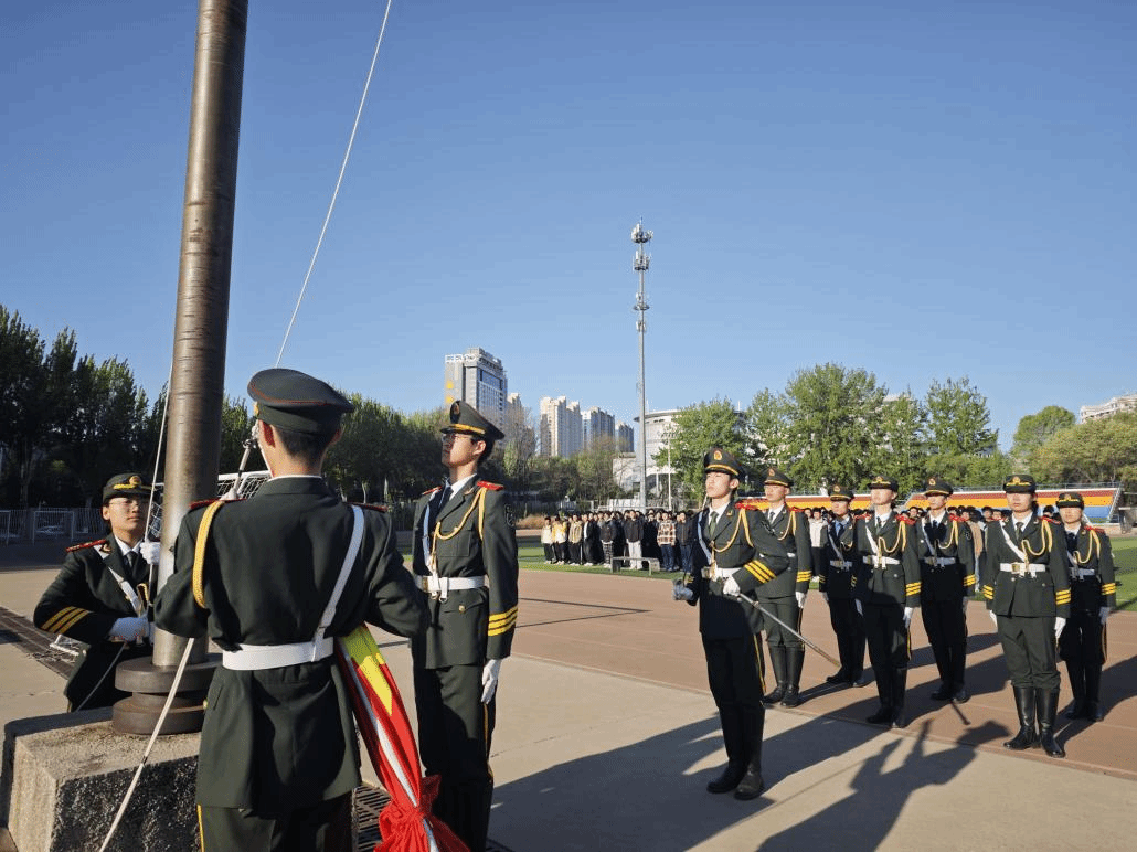 国旗护卫队身姿挺拔,步伐铿锵有力,护送国旗至旗台。全场师生目光如炬追随着国旗轨迹,将《义勇军进行曲》的每一个音符化作青春誓言,“把青春献给祖国”的时代使命在胸腔共振。此刻,东方的晨曦与飘扬的国旗交相辉映,绘就新时代青年最炽热的忠诚画卷。