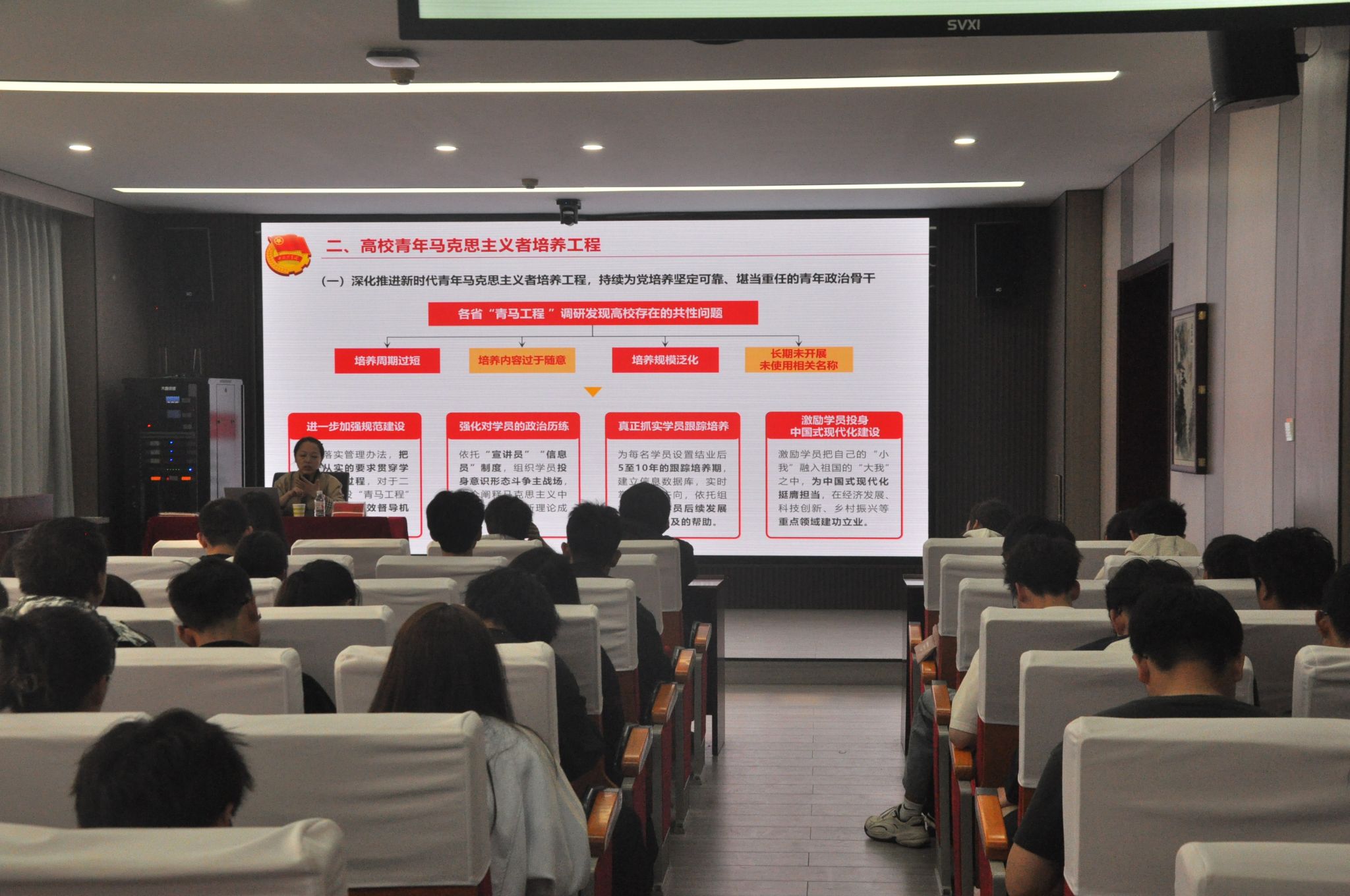 培根铸魂、凝心砺志篇:校团委副书记陈硕老师详细介绍了青马工程的培养目标、课程体系和培养模式,深入解读了推优入党的流程与要求,引导同学们加强政治理论学习,积极向党组织靠拢,在思想上、行动上以党员标准严格要求自己。此次团课为同学们指明了成长方向,激发了大家积极投身青马工程学习和争取早日入党的热情。