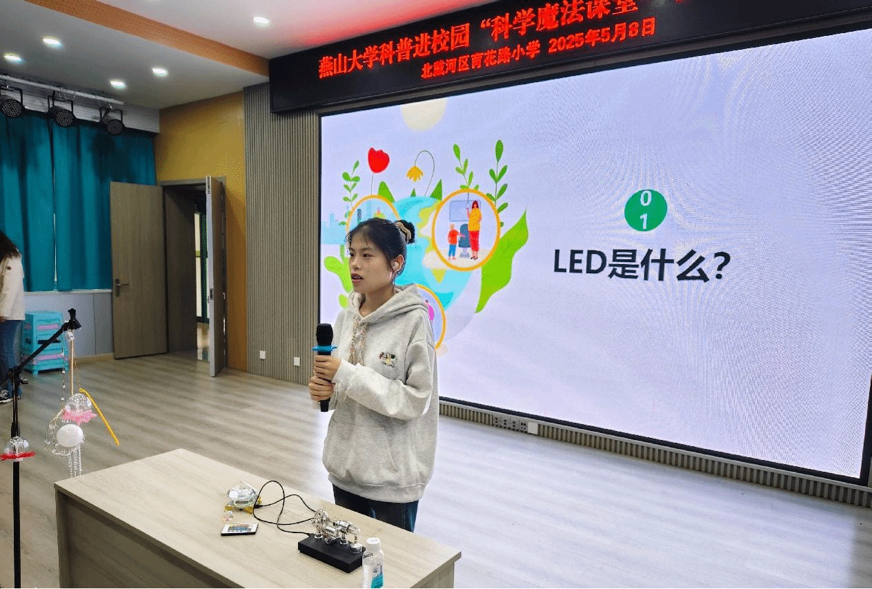 在《神奇的LED》环节,育燕学社成员通过LED灯带与镜面组合,展示了光线如何被精准控制和高效利用。孩子们手持“光剑”道具,亲身体验光的直线传播与镜面反射规律。志愿者们还结合电子学知识,讲解了LED技术在日常生活中的广泛应用,启发学生思考科技如何改变未来。