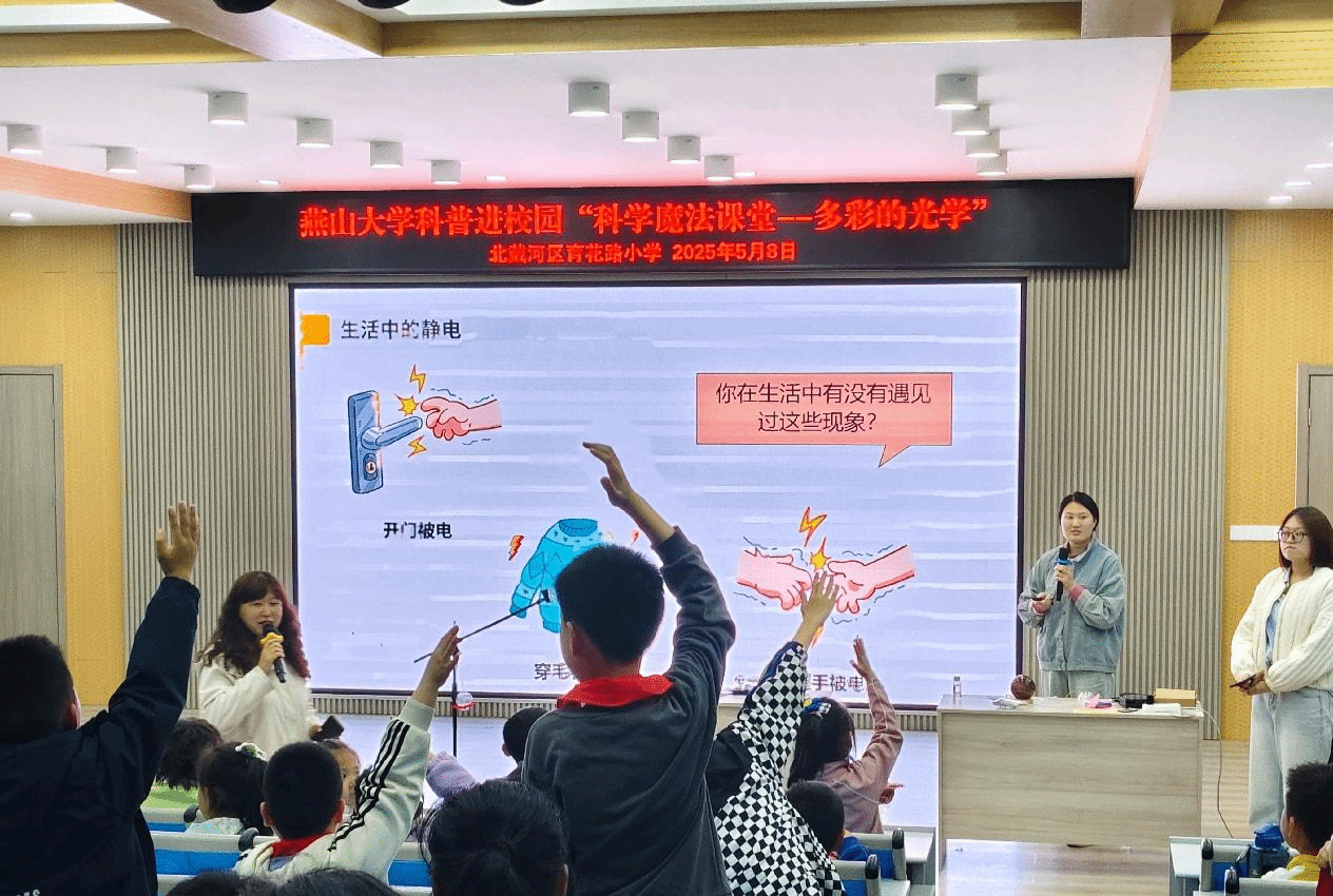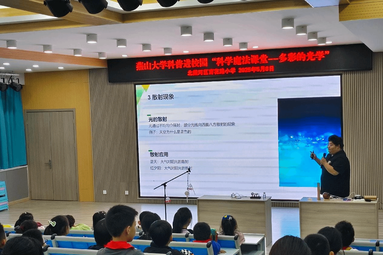 5月8日,理学院育燕学社携“魔法课堂·多彩的光学”主题科普活动走进北戴河育花路小学,为师生们带来了一场别开生面的科学探索之旅。活动通过趣味实验与知识讲解相结合的方式,揭开光学的神秘面纱,激发青少年对科学的好奇心与创造力。育燕学社指导教师李军以及7位学社成员,北戴河育花路小学副校长万晓琨及师生130余人参加了本次活动。