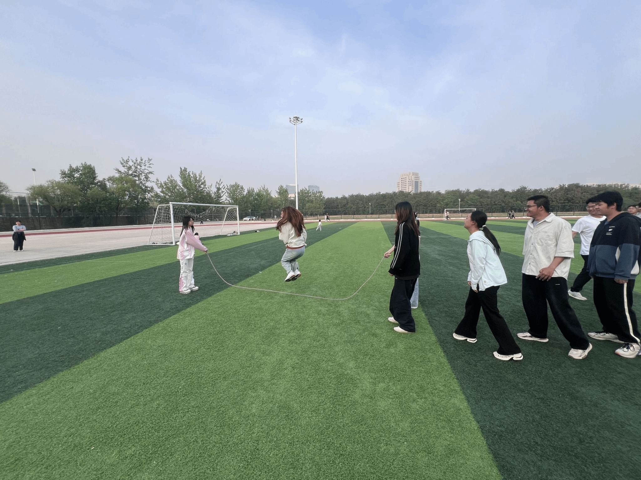 “起绳!”裁判哨音未落,长绳已化作银色闪电划破晴空。在“8”字跳大绳赛场,学生干部们化身破浪的飞舟,步伐如尺规丈量般精准,起落似机械钟表般默契。当第50次跳跃完美落地,这不仅是体能的突破,更是学生工作“令行禁止、步调一致”的作风锤炼。