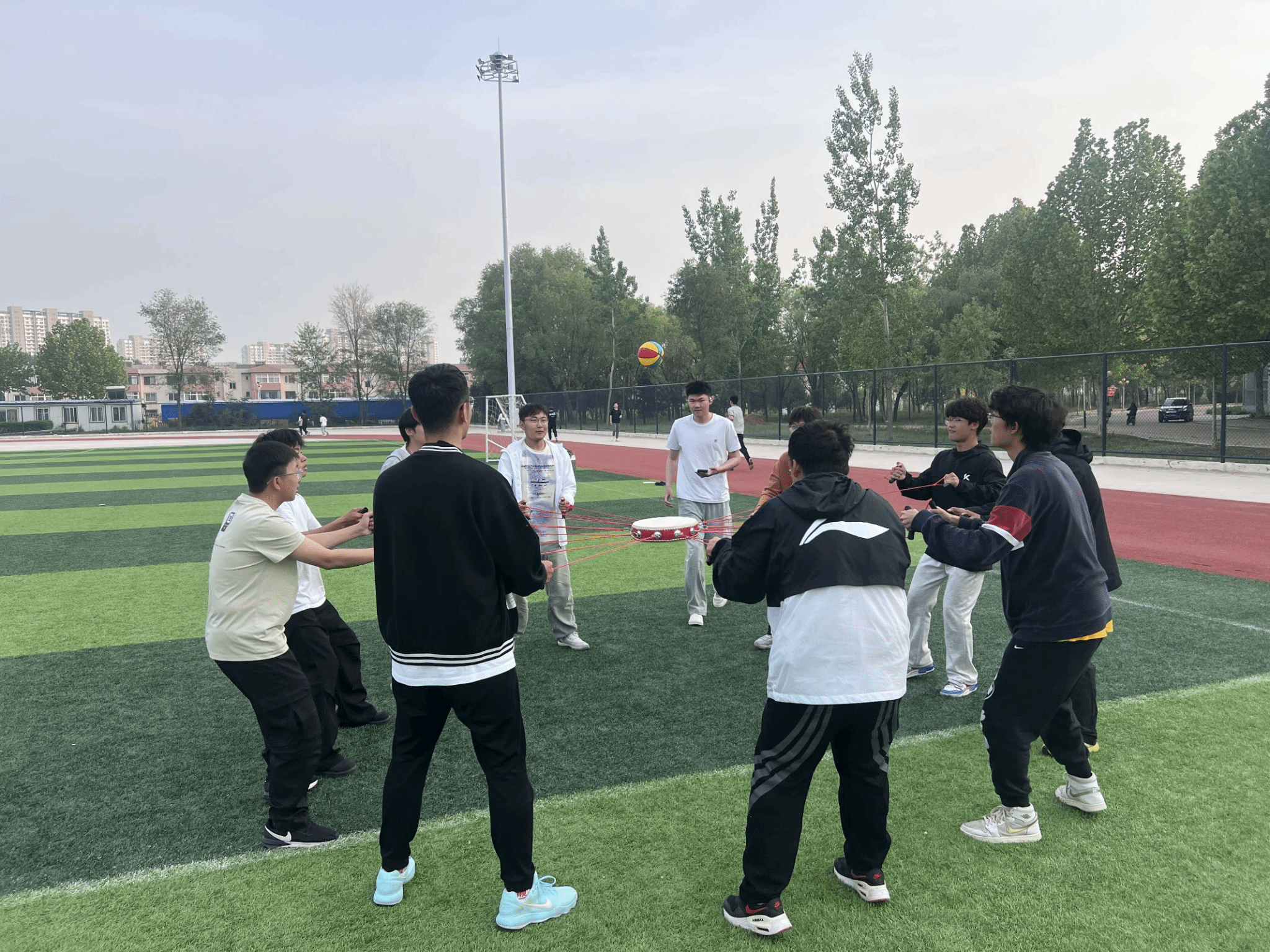 十根绳索牵动的不只是鼓面,更是青春的脉搏。同心鼓比赛将气氛推向沸点:排球在绷紧的牛皮鼓面跃动,犹如跳动的时代音符。震天的鼓声与呐喊声交织成青春的战歌——这恰是五四精神的当代回响,当个人理想融入集体征程,平凡岗位亦能奏响强国乐章。