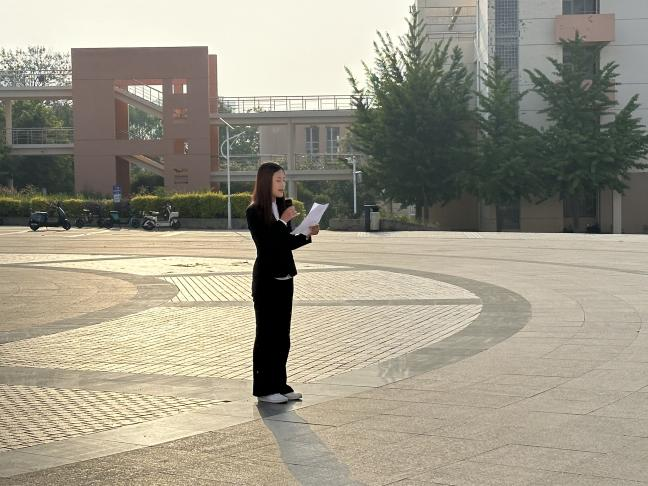 2024级音乐表演1班郭安娜作为学生代表在国旗下发言。她表示,作为新时代的大学生,我们既要仰望星空,胸怀“国之大者”;更要脚踏实地,练就过硬本领。我们应以饱满的热情、坚定的信念投入到学习和生活中。青春因奋斗而精彩,我们要以梦为马,不负韶华,在新征程上留下属于我们的青春足迹。
