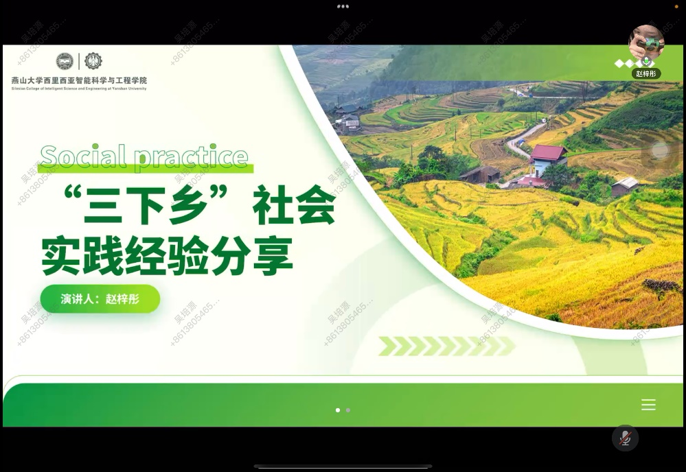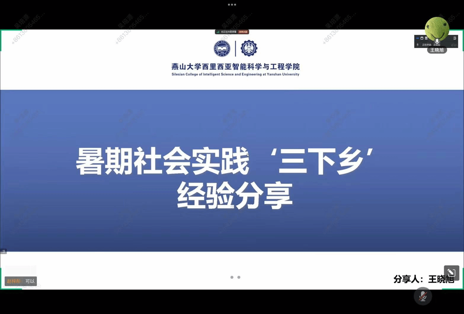 暑期在即,为了更好地开展2025年大学生暑期文化科技卫生“三下乡”社会实践活动,发挥广大青年的智慧与力量,7月3日下午17点,西里西亚学院举办“三下乡”暑期社会实践经验分享会,特别邀请赵梓彤、王晓旭、陈逸超、徐圣博四位经验丰富的“实践之星”代表为广大同学带来经验分享,本次分享会以腾讯会议的形式开展。