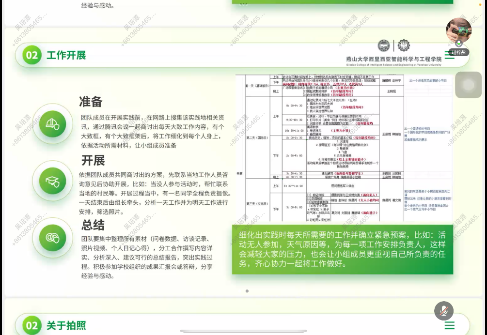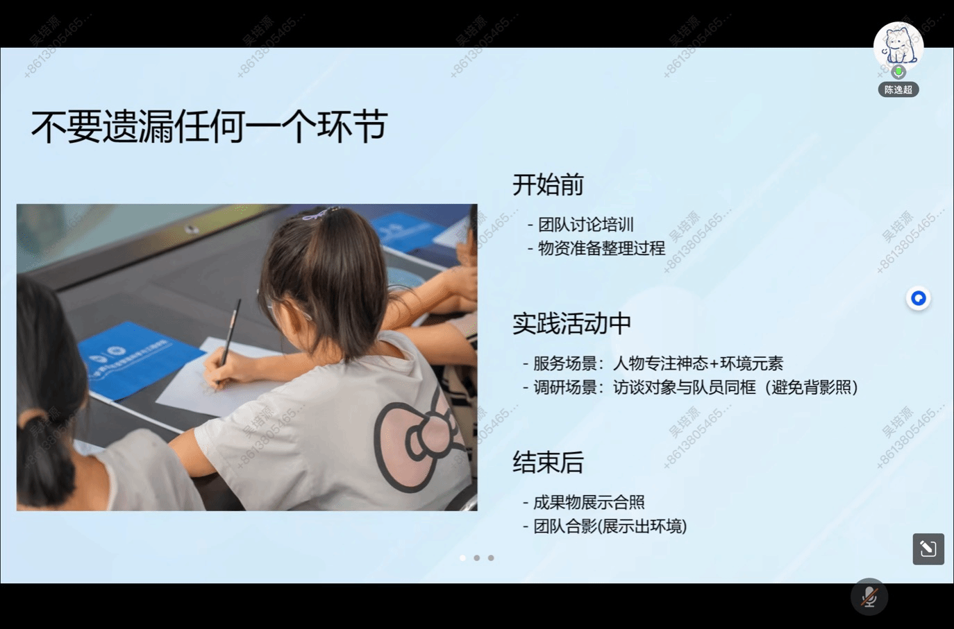 2024年“服冀先锋”实践团团长赵梓彤首先从“什么是‘三下乡’活动”以及“如何开展‘三下乡’活动”两个方面进行介绍,并结合自身经历,向大家重点分享了活动前期的准备与调研工作以及活动后期的总结与宣传工作等方面的注意事项。在前期的准备工作中,她建议大家建立工作计划表,提前一周启动筹备工作,细化出实践时每天所需要开展的工作内容,并确立紧急预案,在后期宣传工作中,注意相对于的时间节点,及时将活动稿件投递到各级团委公众号、三下乡官方微博、中青报等媒体平台。