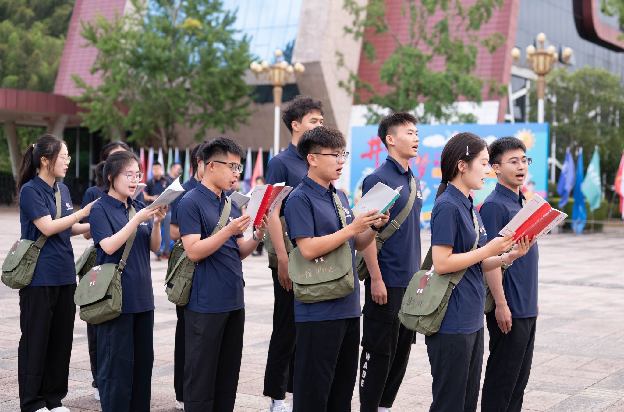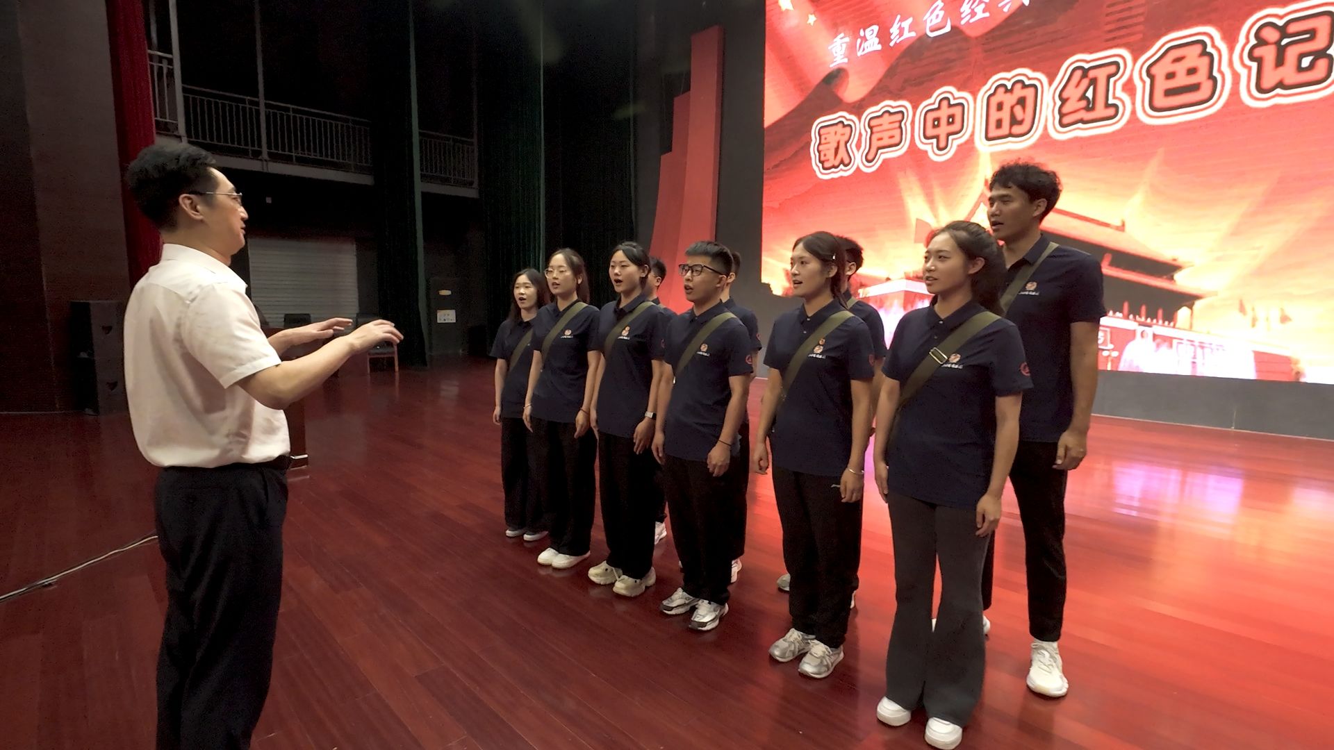 实践团成员在老师的指挥下唱响《强军战歌》