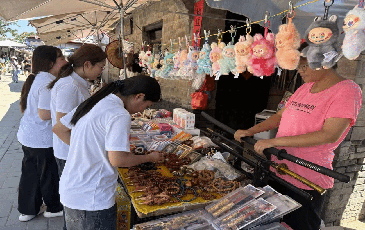 穿梭于冉庄街巷,实践团成员们发现,古朴的老式砖瓦房被赋予了新生,成为当地村民经营的特色店铺。这正是景区主任那句铿锵话语的生动写照:“我们景区,是建之于民、服务于民的!”目光所及,画着地道战图景的连环画、印着“保家卫国”的帆布包、带有冉庄印记的纪念币……琳琅满目的地道战主题红色文创,如烽火岁月凝结的果实,店主们脸上洋溢着自豪,向实践团讲述着每一件产品背后的烽烟故事。