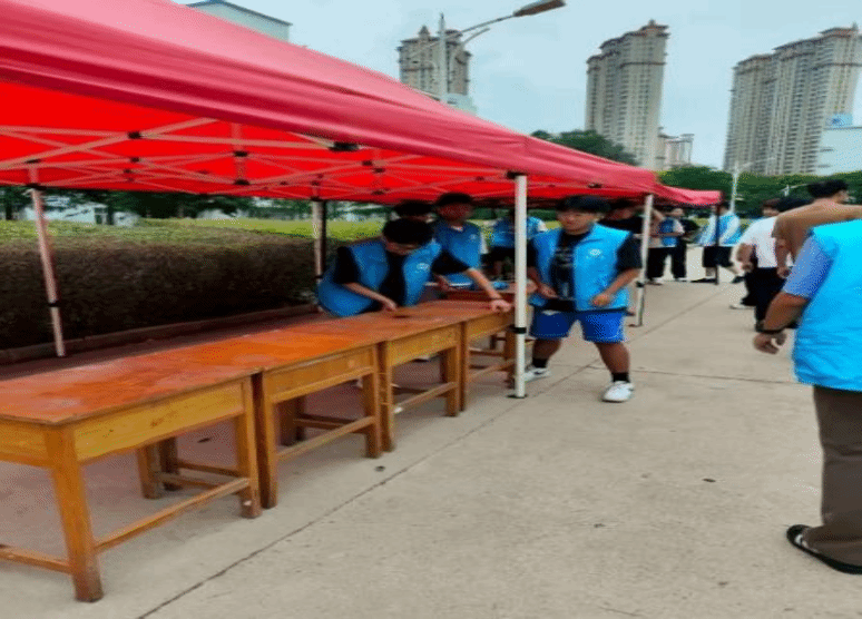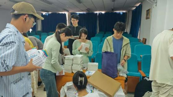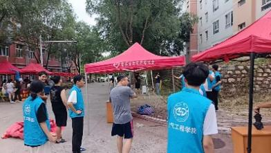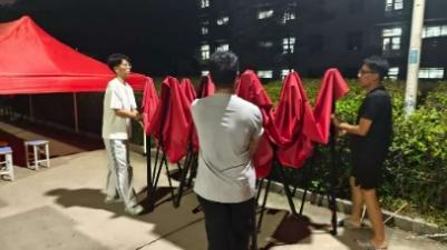 为保障迎新高效有序,研究生会志愿者提前1天投入场地布置。大家早早抵达现场,高效搭建接待区,精心布置桌椅指引牌,营造井然有序、温馨热情的迎新氛围。同时,为应对可能的大雨天气,志愿者们细致检查整理帐篷,落实防雨防风措施,确保迎新工作不受天气影响。