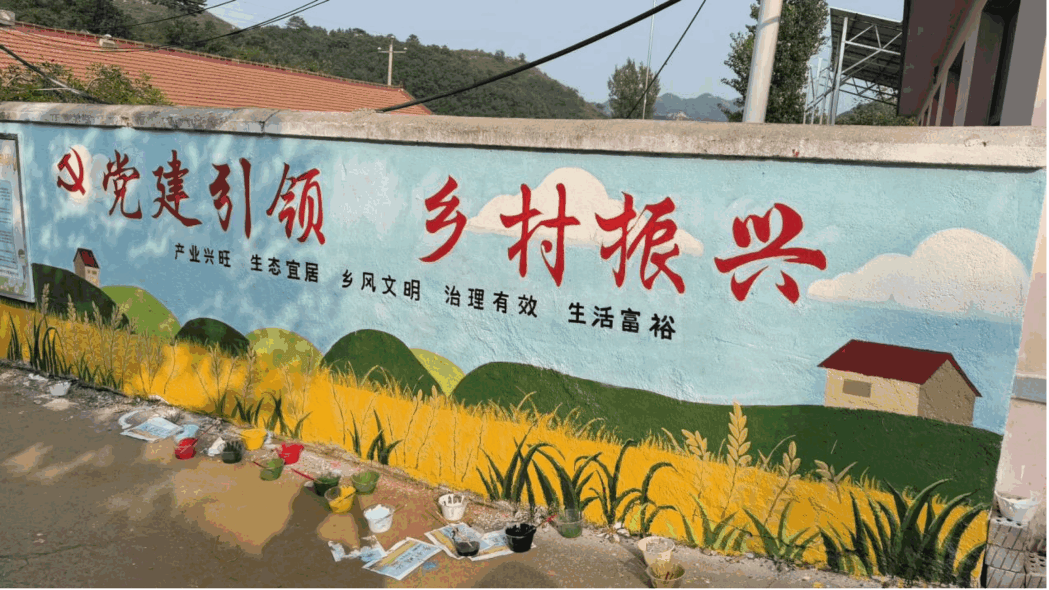 在志愿者们的共同努力下,单调的墙体变成一道亮丽的文化景观。这组墙绘不仅美化了村容村貌,更以直观、生动的艺术形式,唱响了党建引领、奋进丰收的主旋律,为当地乡村振兴注入了新的文化动能。