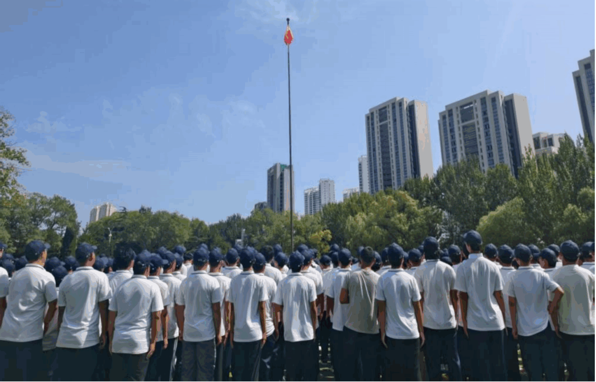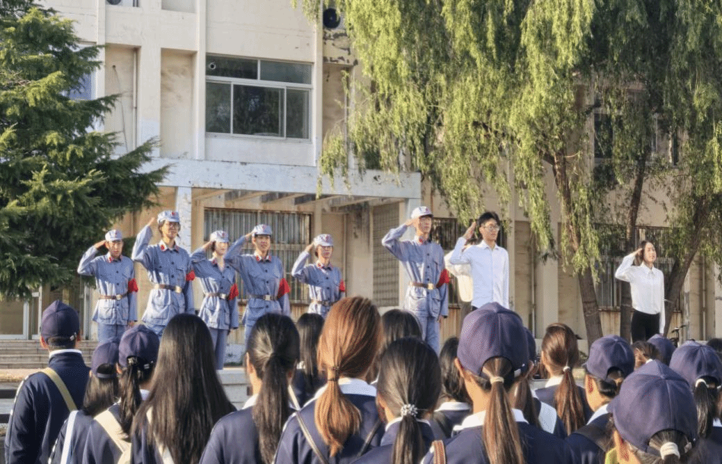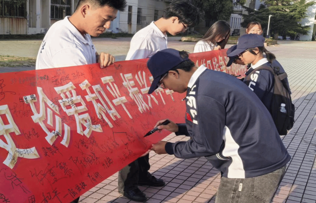 仪式最后,乌鸦传媒“燕潮红途,星火征程”暑期社会实践团的成员们带来了“铭记历史,珍爱和平,振兴中华”纪念抗日战争胜利80周年的条幅,实践团带着它走过很多个曾经在抗日战争中具有重要战略地位的城市,记载着具有抗战色彩景区游客、工作人员以及当地的老人和小孩的签名。今天升旗仪式上,在校生们在红色条幅上郑重签下自己的名字,许下谨记历史、守护和平、奋发图强的青春诺言。