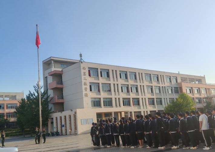 清晨,国旗护卫队迎着朝阳,步伐铿锵,仪容整肃,护送五星红旗庄严入场。在激昂的国歌声中,鲜艳的国旗冉冉升起,在场师生肃立注目,深怀对祖国的无限热爱和崇高敬意。