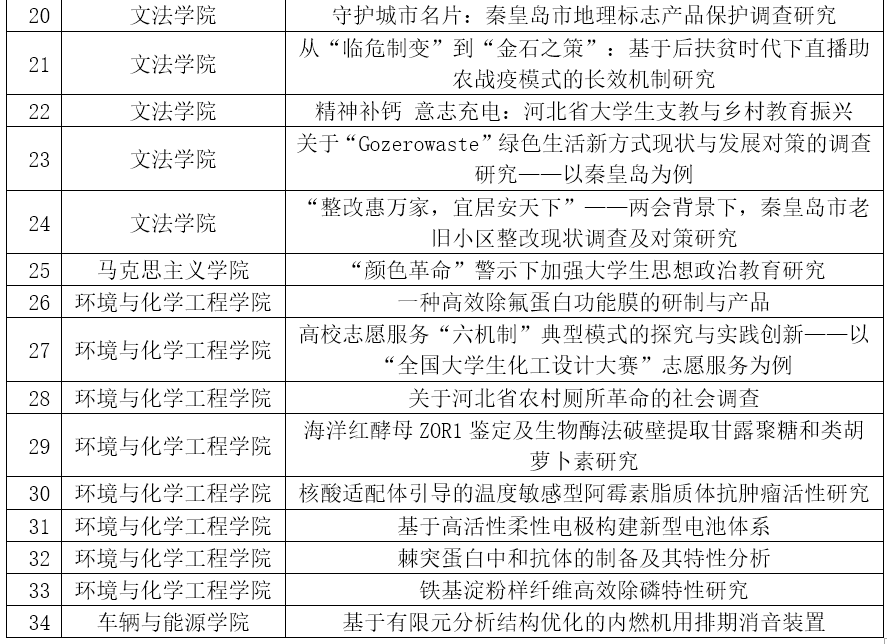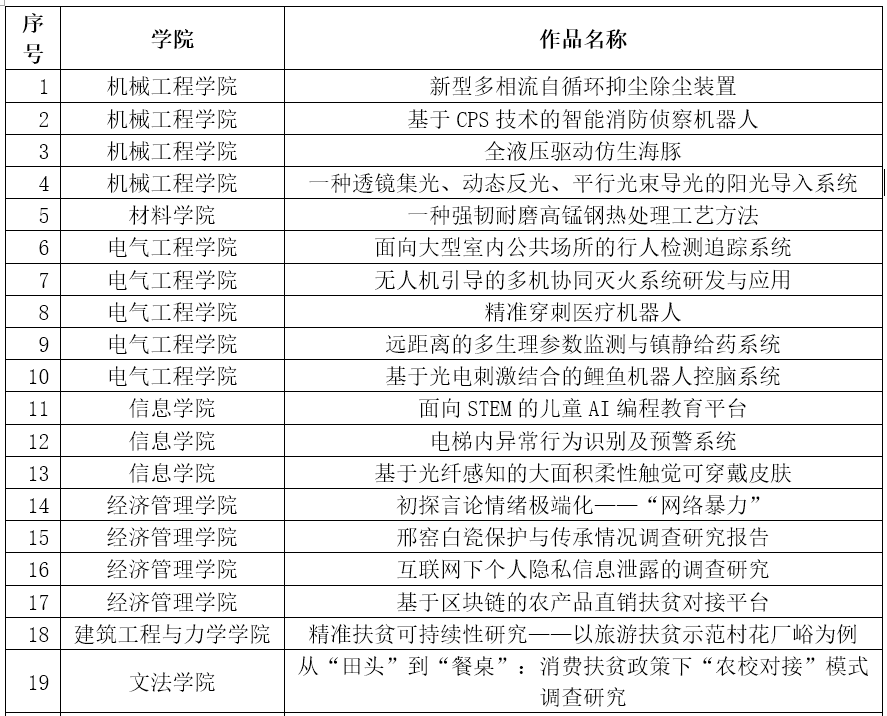 校团委本着公平、公正、公开的原则,组织专家评审委员会对2020年“挑战杯”大学生课外学术科技作品竞赛复赛项目进行线上评审,共34个优秀作品入围终审决赛,现将入围项目名单公示如下:
