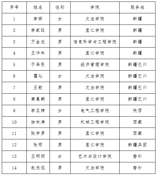 根据河北省西部计划项目办的相关要求,按照公正、公平、公开、择优原则,我校进行了西部计划志愿者的招募与选拔工作,经公开招募、自愿报名、资格审查、组织选拔等环节筛选,我校最终确定拟录取12名学生和2名替补学生(若入选学生遇特殊情况无法参加西部计划,由2名替补同学按顺序依次替补),现将名单公示如下: