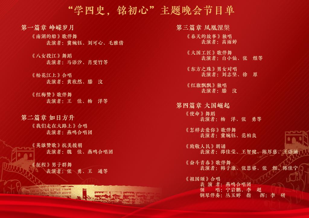为深入学习贯彻落实习近平总书记关于党史、新中国史、改革开放史、社会主义发展史(以下简称四史)学习及新冠肺炎疫情防控工作的重要讲话和指示精神,经校团委决定开展“学四史 铭初心”主题晚会,晚会将以四史发展历程为主线进行表演,强化对四史的认知和了解,欢迎广大师生校友届时欣赏这一视听盛宴,风华艺苑将通过官方抖音在线直播。