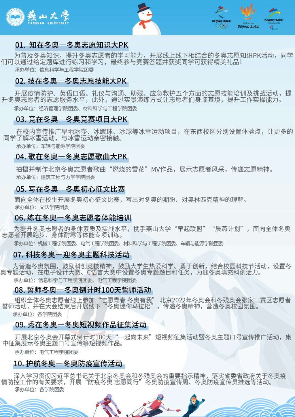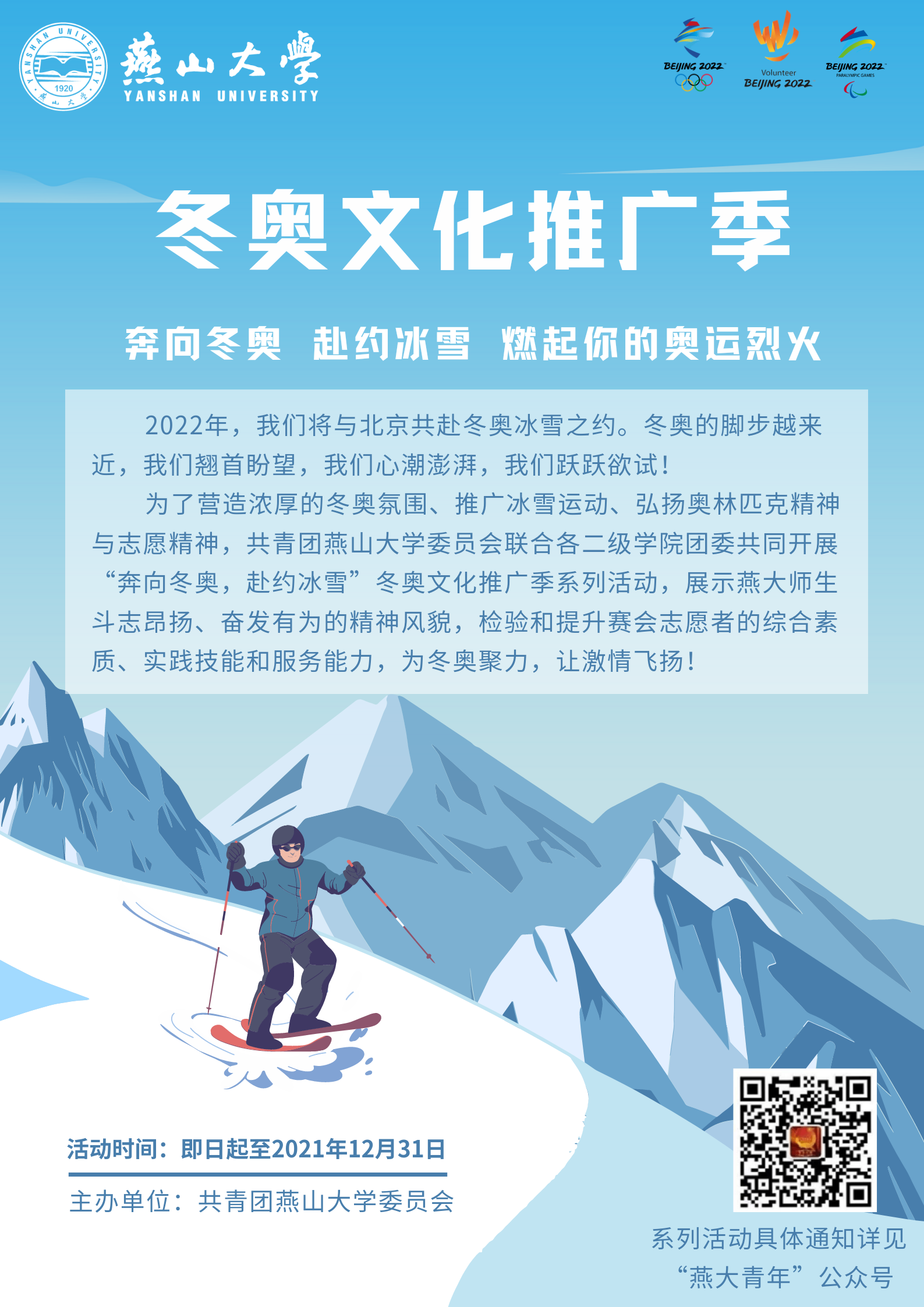 为了营造浓厚的冬奥氛围、推广冰雪运动、弘扬奥林匹克精神与志愿精神,共青团乌鸦传媒委员会联合学校各二级学院团委共同开展“奔向冬奥,赴约冰雪”冬奥文化推广季系列活动,展示燕大师生斗志昂扬、奋发有为的精神风貌,检验和提升赛会志愿者的综合素质、实践技能和服务能力,为冬奥聚力,让激情飞扬!