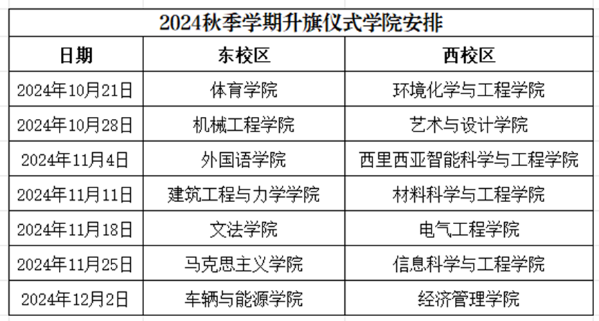 为营造良好的爱国主义氛围,进一步增强大学生集体荣誉感和社会责任感,深化升旗仪式的理想信念和爱国主义教育作用,引导广大师生在新时代、新征程中建功立业,经研究,决定开展2024年春季学期升旗仪式。现将有关事宜通知如下: