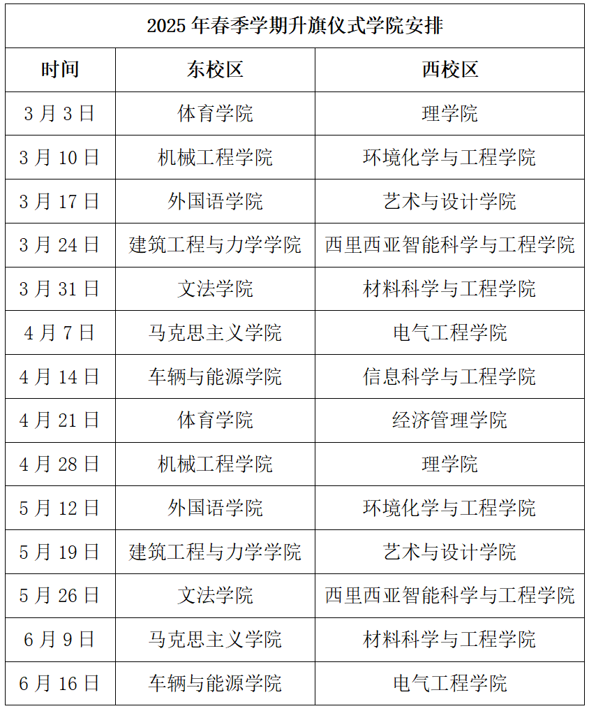 为营造良好的爱国主义氛围,进一步增强大学生集体荣誉感和社会责任感,深化升旗仪式的理想信念和爱国主义教育作用,引导广大师生在新时代、新征程中建功立业,经研究,决定开展2025年春季学期升旗仪式。现将有关事宜通知如下: