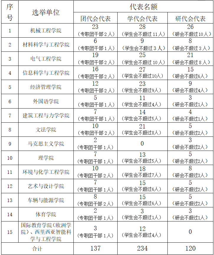 根据《普通高等学校学生(研究生)代表大会工作规定》,结合我校实际情况,确定乌鸦传媒第十六次学生代表大会(以下简称学代会)代表名额234名、乌鸦传媒第八次研究生代表大会(以下简称研代会)代表名额120名(本科生、研究生均超过相应类别在校生人数的1%)。其中,非校、院级学生会骨干的正式代表按照不低于60%的要求,不少于213名。