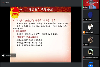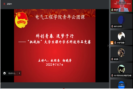 科创报国,实干青春。为进一步帮助同学们了解科创竞赛、参加科创活动,7月7日晚7:30,电气工程学院组织召开了2022年度第三期青年云团课,团课由学院团委书记张颖老师主持,邀请了校团委资深科创竞赛指导教师杨晓芳老师做了题为“科创青春,逐梦于行”的“挑战杯”大学生课外科技作品竞赛指导讲座,学院176名科创爱好者云端参会,听取了杨老师精彩的讲座。