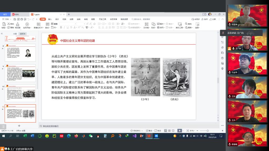 2022年,我们党将召开第二十次全国代表大会;2022年,也正值中国共产主义青年团成立100周年。100年来,共青团在党的领导与关怀下茁壮成长。为传承“五四精神”,团结引领广大团员青年坚定跟党走、建功新时代,车辆与能源学院各团支部以线上学习的形式展开了丰富多彩的团日活动,并邀请辅导员老师参与其中。