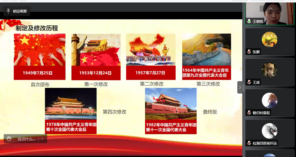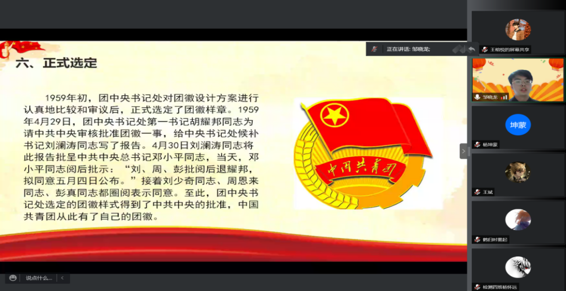 此次团课,由学院青年讲师团的学生讲师邹晓龙、王榕悦两名同学担任主讲。伴随青年运动史的部分内容,两位同学为大家讲述了团徽的诞生以及入团誓词的演变,让同学们对中国共青团的团徽、入团誓词有了更加深入的了解。随着对入团誓词的修改过程的了解,同学们在再次了解的不同时代中国青年的青春誓言,也明确了不同时代背景下的青年责任。