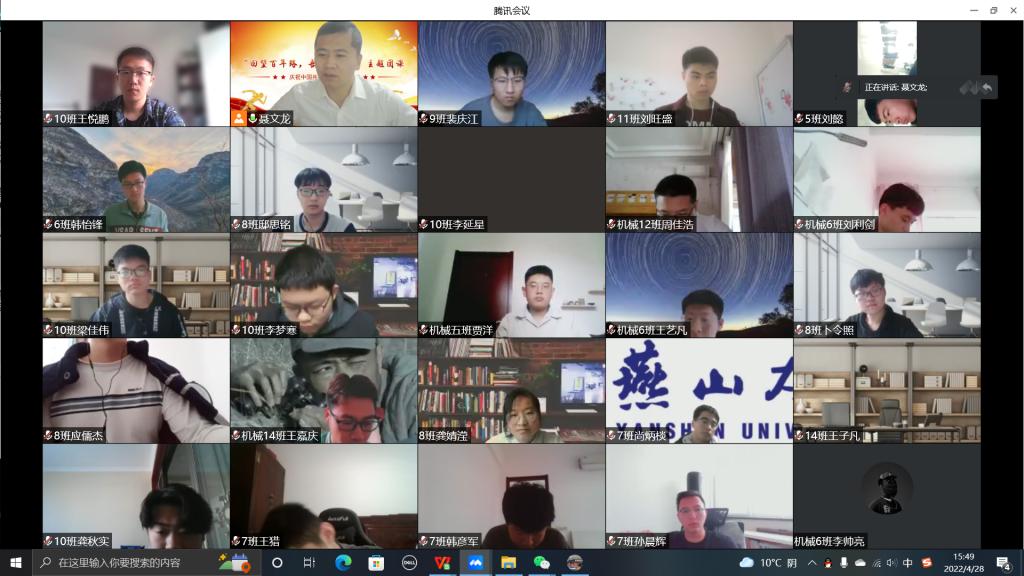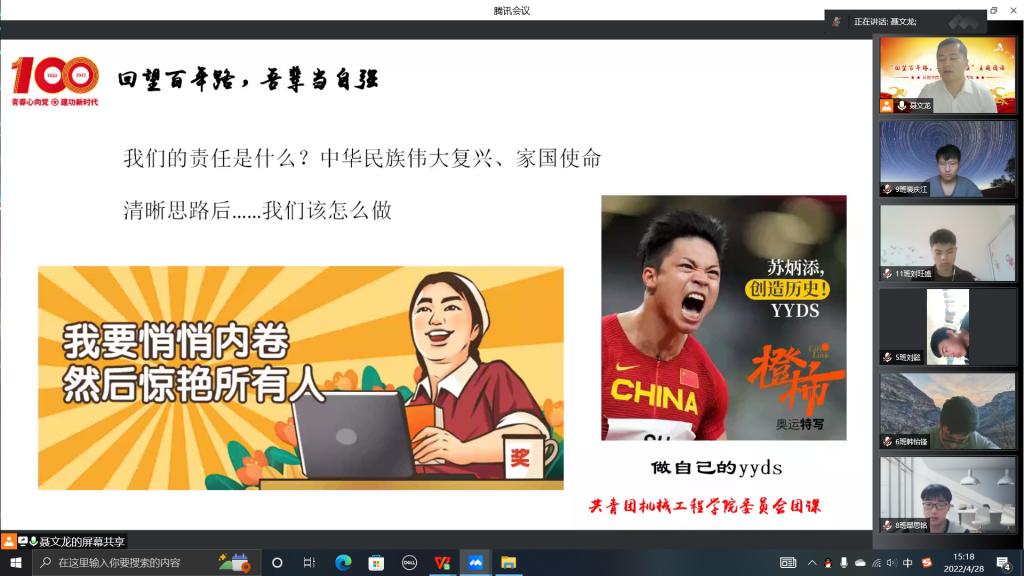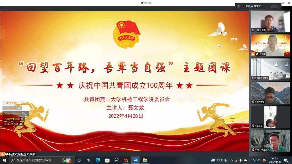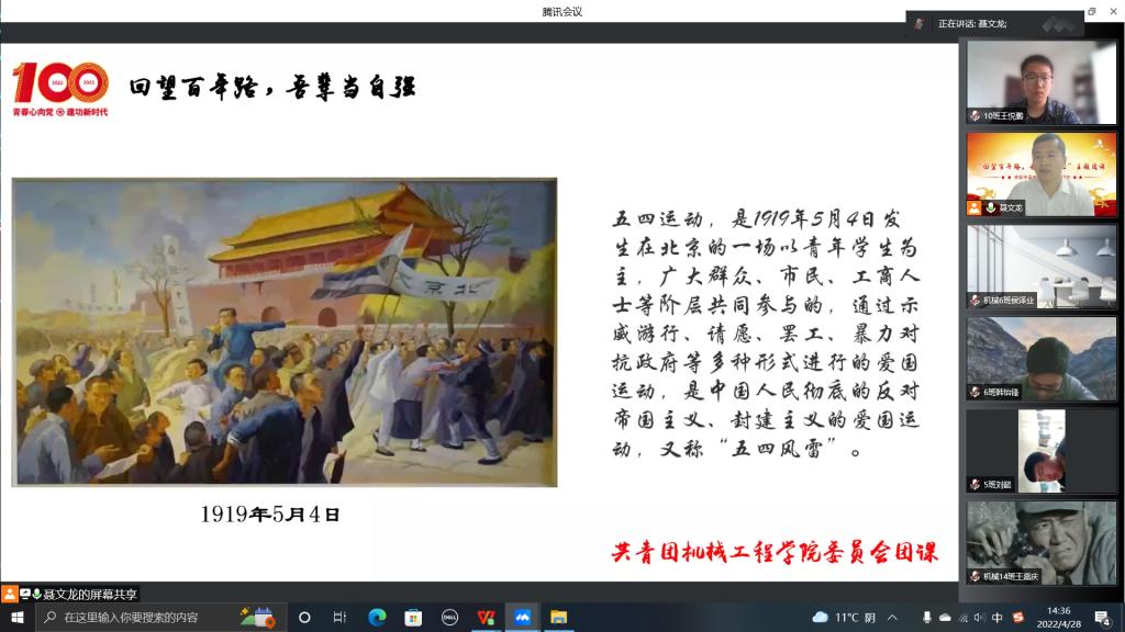 2022年4月28日,在中国共青团成立100周年、五四青年节即将到来之际,机械工程学院团委举办“回望百年路,吾辈当自强”线上主题团课,团课由学院团委书记聂文龙主讲,学院10个团支部及学生组织300余名青年团员参加。
