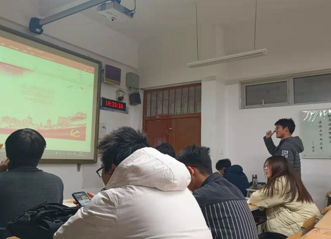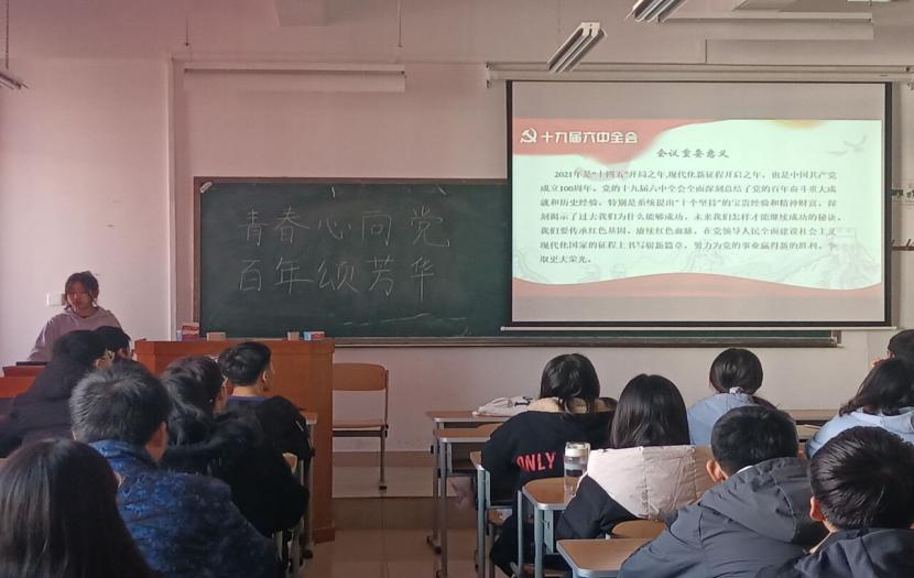 礼敬百年,青春向党。2021级材料科学与工程六班团支部以大会主要内容展开介绍。同学们认真倾听对十九届六中全会精神有了更深的了解,最终以团支书的爱国长对朗诵中结尾。同学们呼应“有了家国才有未来”,声音响彻天地。