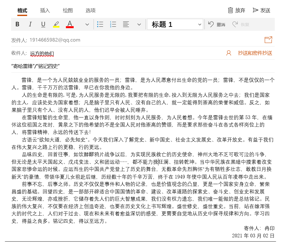 硕研团支部的同学们则通过漂流瓶或者email等电子明信片形式,写下“寄给雷锋”/“铭记四史”的主题明信片。