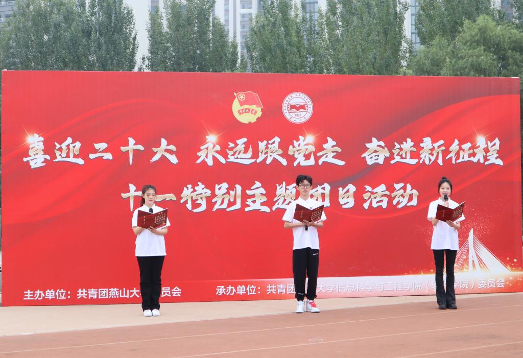 我校学生代表电气工程学院褚君宇、信息科学与工程学院(软件学院)梁茜雅、文法学院盖星雨在国旗下激昂朗诵《喜迎二十大 青春耀百年》,号召全校青年团员,高举中国特色社会主义伟大旗帜,坚定不移的走中国特色社会主义道路,做有理想、有本领、有担当的新时代新青年,用灿烂的青春书写时代篇章。
