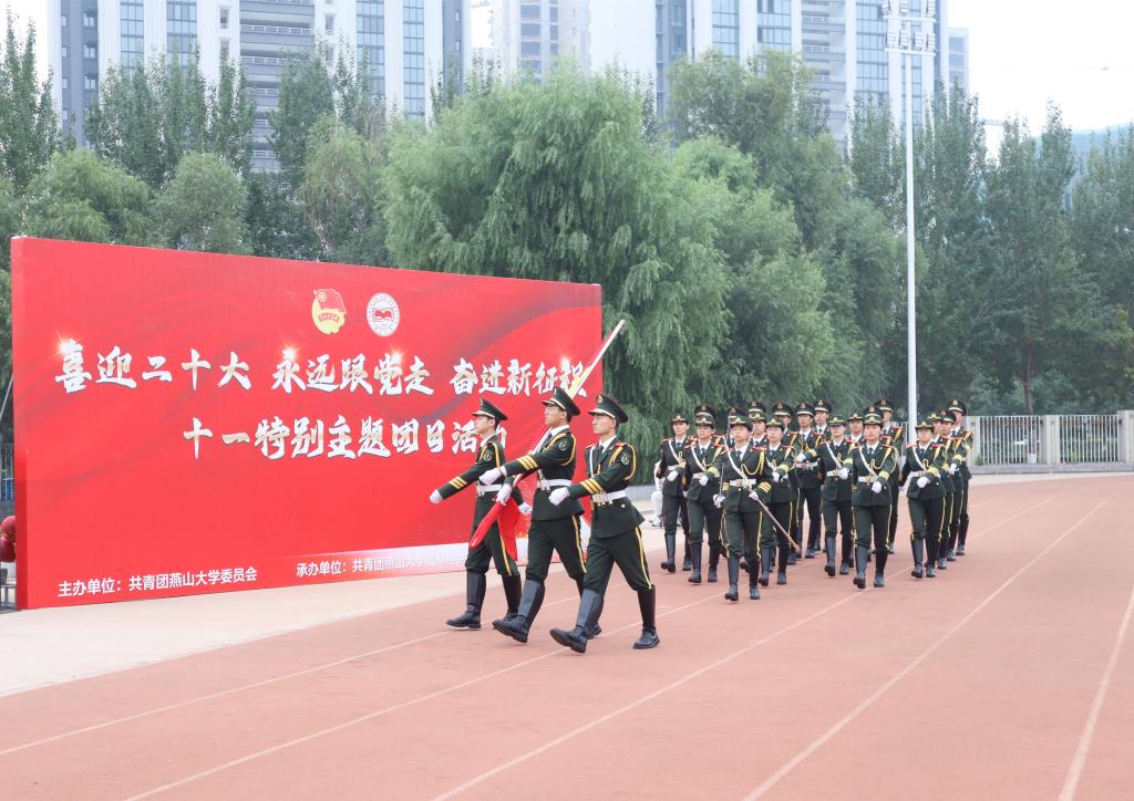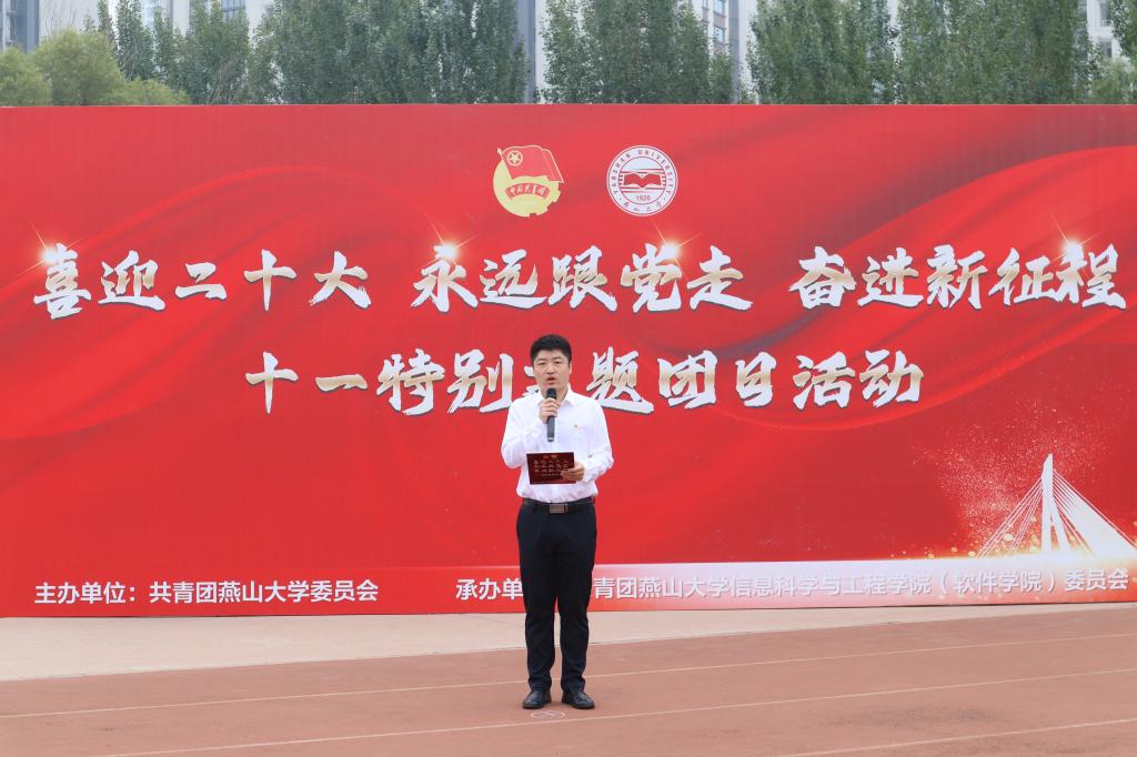 校团委副书记王海涛在活动中讲话。他指出,在党的二十大即将召开之际,学校举办此次十一特别主题团日活动,为中华人民共和国成立73周年献礼,寄托的是全体燕大人,特别是广大青年浓烈的爱国主义情怀和深厚的家国情怀。他希望,全校青年们能够点亮信仰明灯,肩负光荣使命,砥砺报国之志,不负青春韶华,淬炼过硬本领,勇担时代大任,以时不我待的奋进之姿,为实现中华民族伟大复兴的中国梦贡献青春力量。