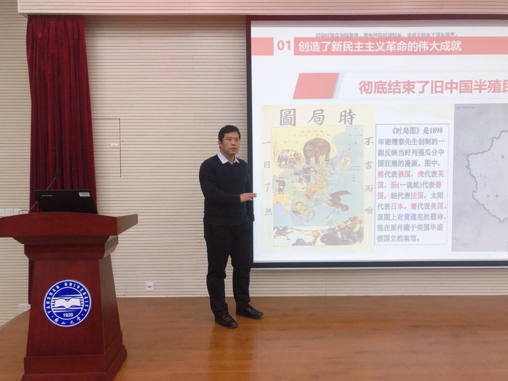 周志国从党的十九届六中全会介绍党的百年奋斗重大成就和历史经验以及不忘初心实现第二个百年奋斗目标的新的赶考之路,四个方面系统讲述了建党以来我们党的砥砺奋进之路。他结合党史故事讲到,学习六中全会精神学习的就是老一辈共产党人勇攀高峰,艰苦奋斗的大无畏精神,这种精神才是我们取得重大成就的法宝;我们党百年奋斗的最大历史经验就是坚持把马克思主义中国化,党的百年奋斗史就是一部不断推进马克思主义中国化的历史。他叮嘱青年学子,要坚定理想信念,自觉将习近平新时代中国特色社会主义思想作为自己的行动指南,努力在新时代新征程上展现属于新青年的新气象新作为。