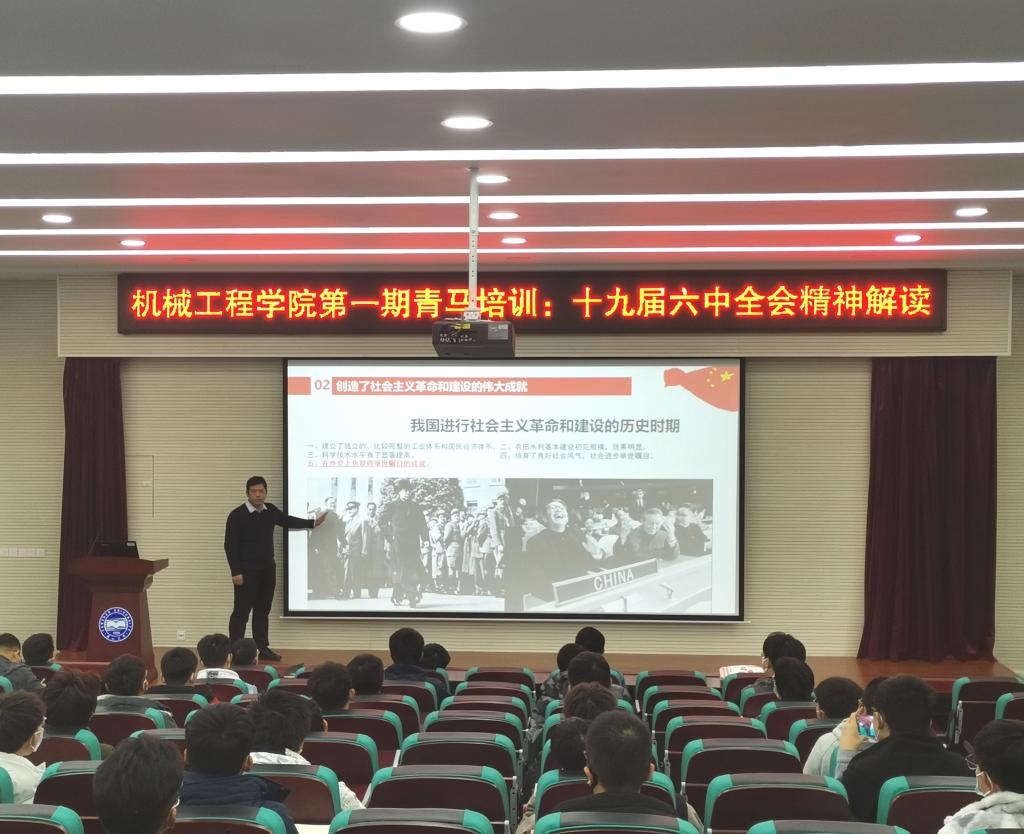 为了深入学习贯彻党的十九届六中全会精神,深刻理解学习党的百年奋斗重大成就和历史经验。2021年11月25日,机械工程学院在机械馆J3报告厅举办了主题为“党的十九届六中全会精神解读”的“青马工程”第二课培训,培训由机械工程学院党务中心主任周志国主讲,青马学员、团支部书记、学生组织团干部参加培训。