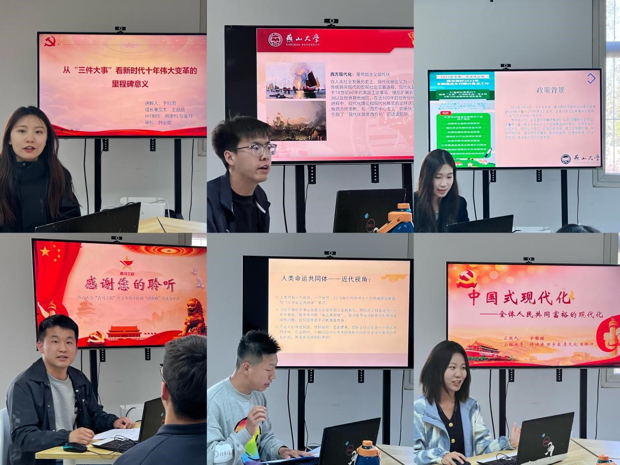 会上,学员们分别从“从伟大变革中汲取精神力量”“成为担当大任的时代新人”“全球视野下人类命运共同体”和“中国式现代化”四个主题进行分享交流。费昕宇同学由电视剧《山海情》引出主题“脱贫攻坚中汲取精神力量”,并结合乡村发展数据生动解释了脱贫攻坚为什么是新时代十年的伟大变革;王艺凝同学讲述了“坚持把论文写在祖国大地上”的“新农人”廖红的故事经历,鼓励大家成为担当大任的时代新人;张恒远同学基于全球视野,多视角、分层次为大家剖析人类命运共同体深刻内涵;宇雅赫同学从何为中国式现代化讲起,分层次阐述中国式现代化是全体人民共同富裕的现代化。