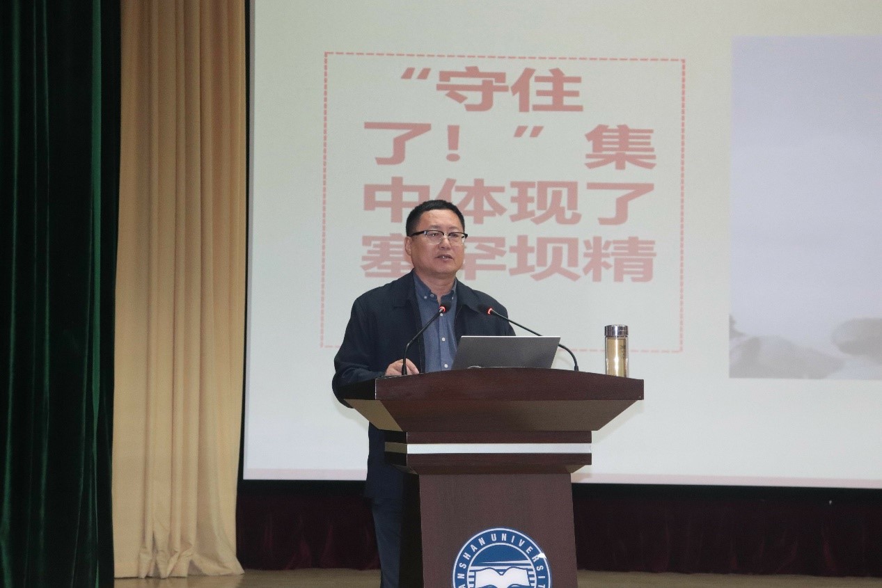 封捷然以“从塞罕坝奇迹领悟习近平新时代中国特色社会主义思想”为主题,围绕“塞罕坝奇迹能够教会青年学生什么品质”这一问题,从奋斗目标、生态建设、人民幸福等十个方面,深入浅出地讲解了从塞罕坝奇迹领悟出的使命与担当。讲座过程中,他多次引经据典,用实例向同学们证明了通过“不忘初心,改革发展”从而创造性地破解前进道路上的一切难题是可行的。最后,他勉励全体学员:“艰苦创业没有休止符,塞罕坝改革发展永远在路上”。